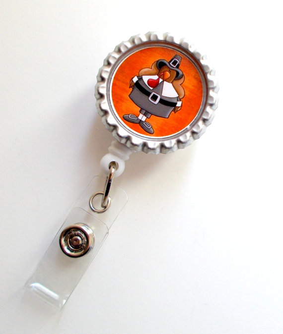 This ID Badge holder features a turkey dressed as a pilgrim. Graphic is sealed with an epoxy sealant. Sits on a silver bottle cap. Bottle cap sits on a white, hard plastic badge reel.