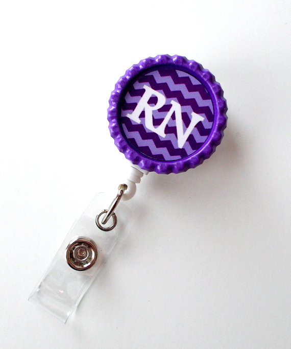 This badge features the initial RN on a purple and lavender Chevron stripe background. Graphic is sealed with an epoxy sealant and sits on a navy blue bottle cap. Bottle cap is glued to a white hard plastic badge reel.