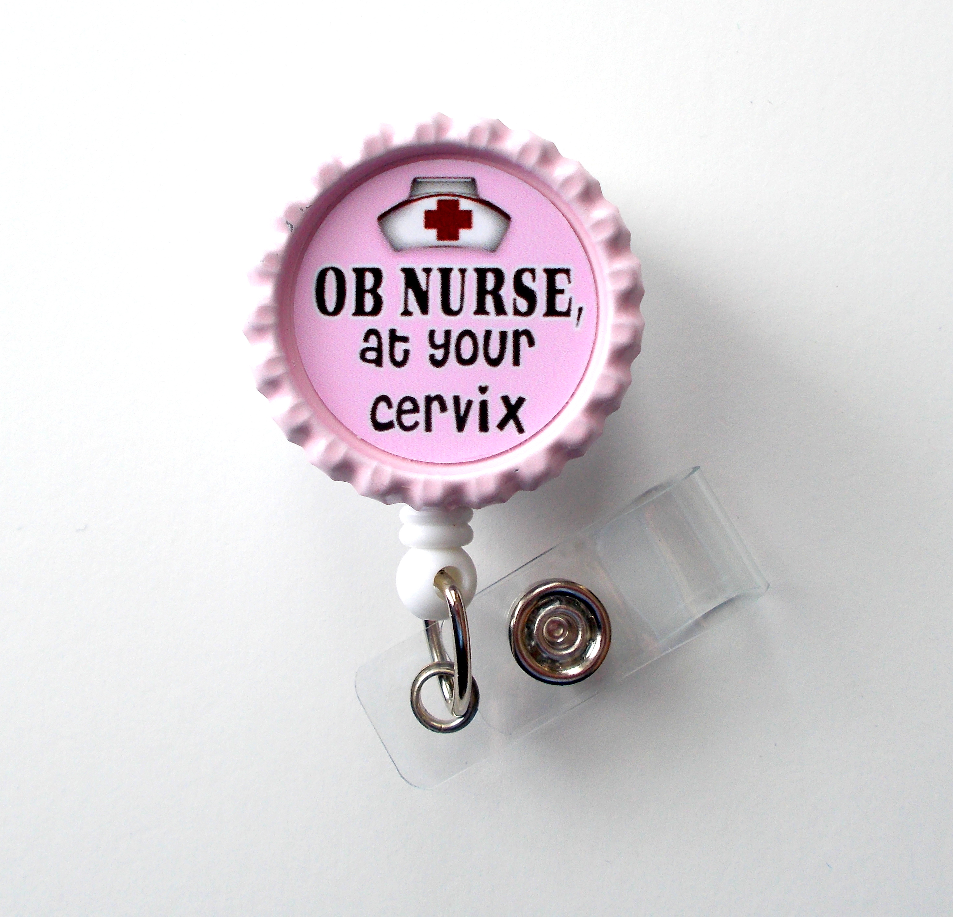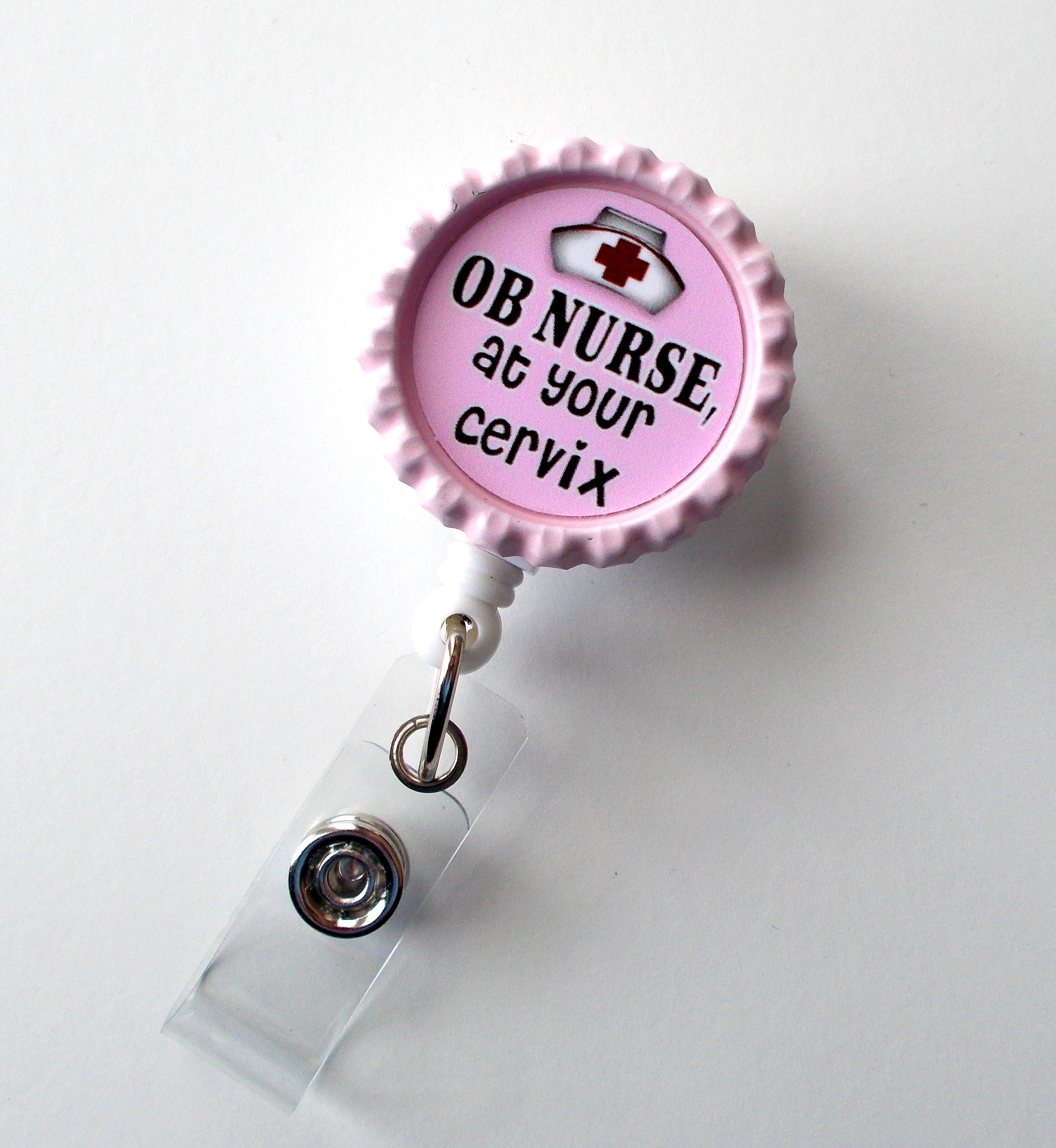 OB Nurse at Your Cervix ID Badge holder in Pink. Sits on a pink bottle cap. Bottle cap is glued to a sturdy white plastic badge reel.