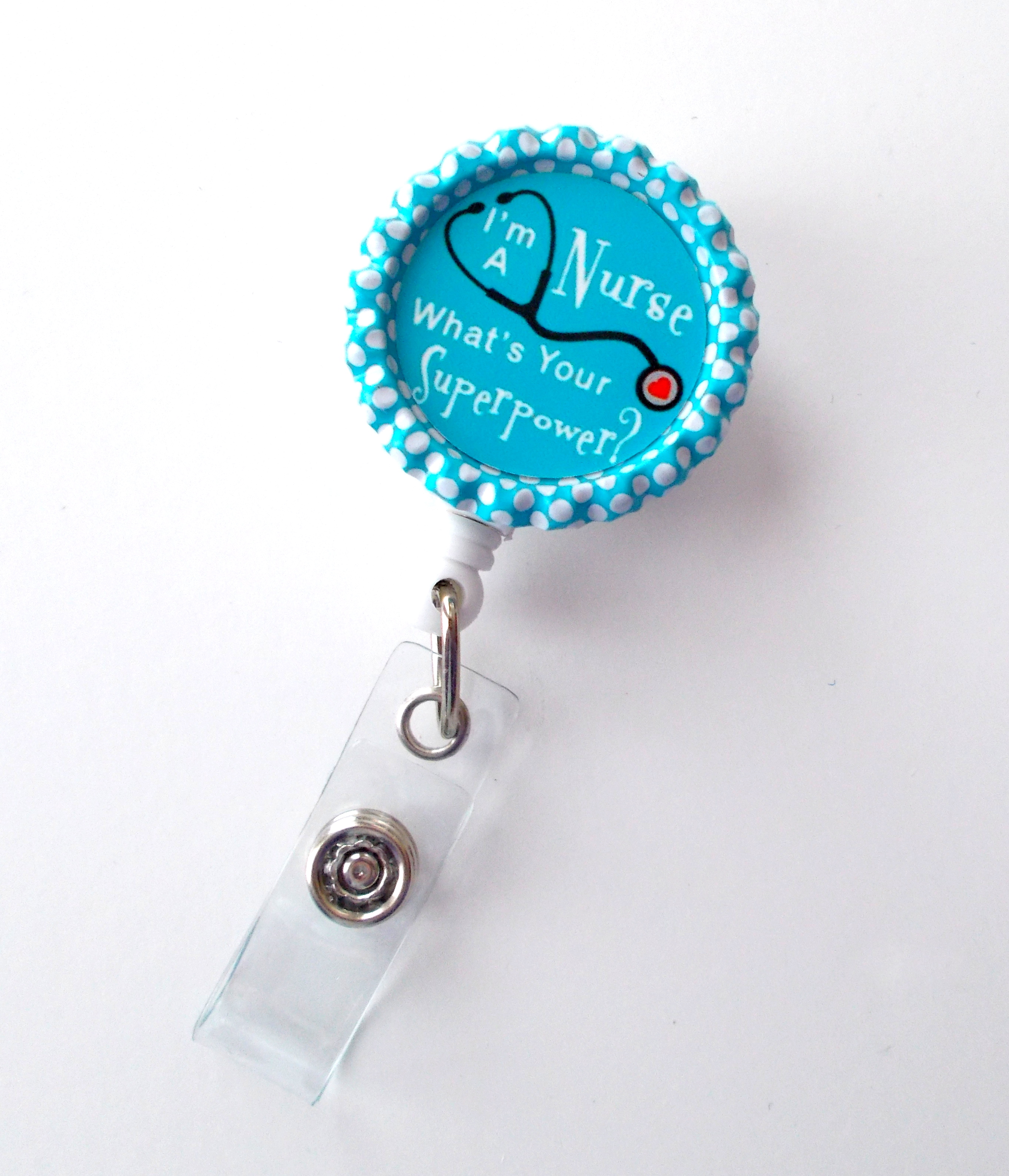 I'm a Nurse What's Your SuperPower ID Badge holder in aqua. Sits on an aqua and white polka dot bottle cap. Graphic is sealed with an epoxy sealant. Sits on a sturdy white plastic badge reel. Badge may be wiped clean but it is not waterproof.