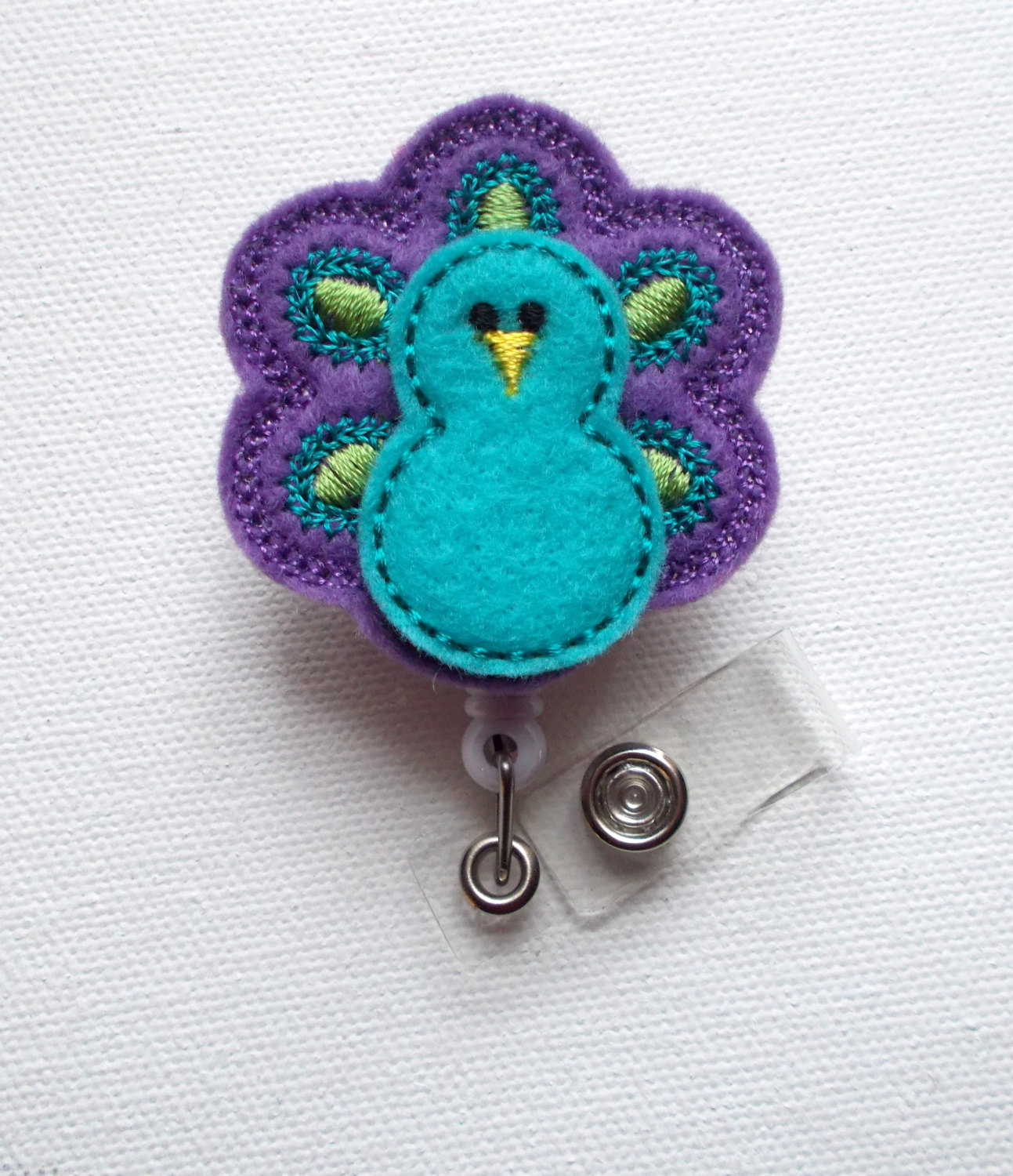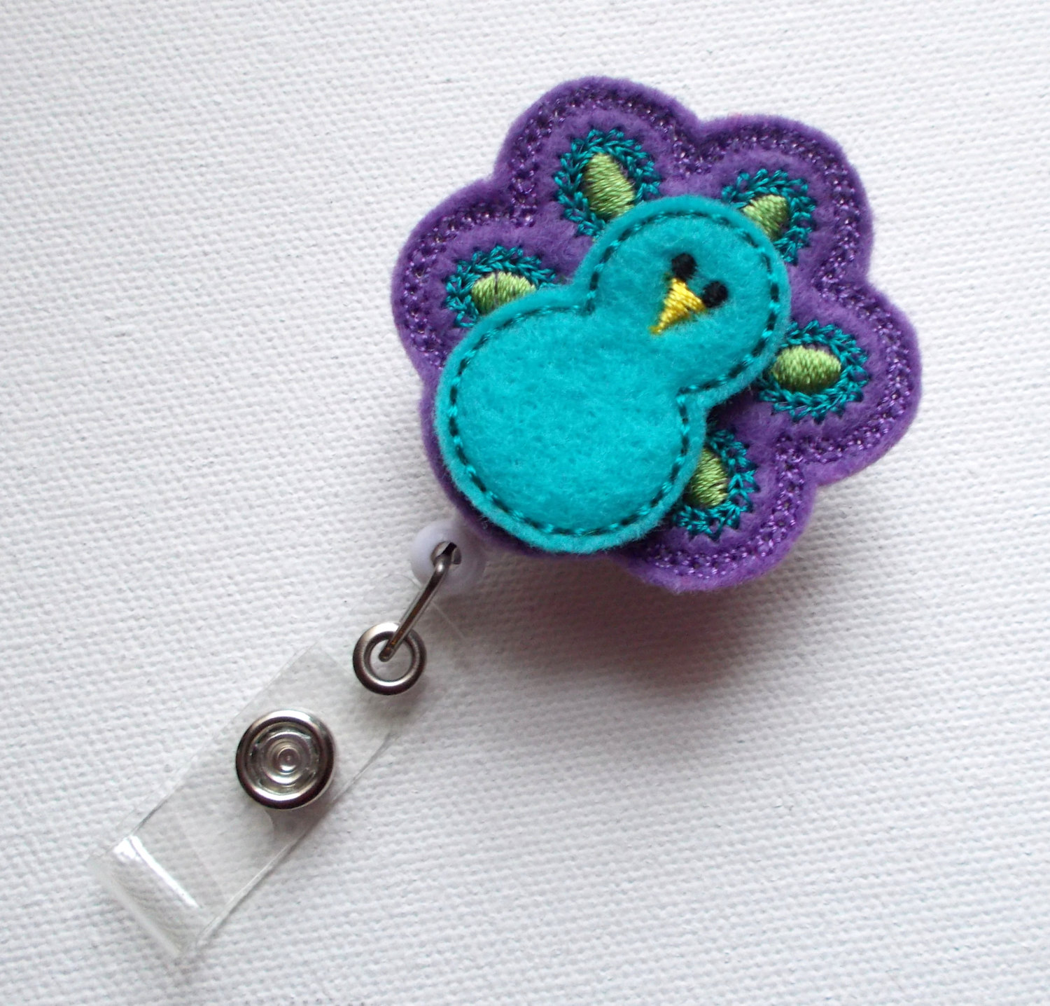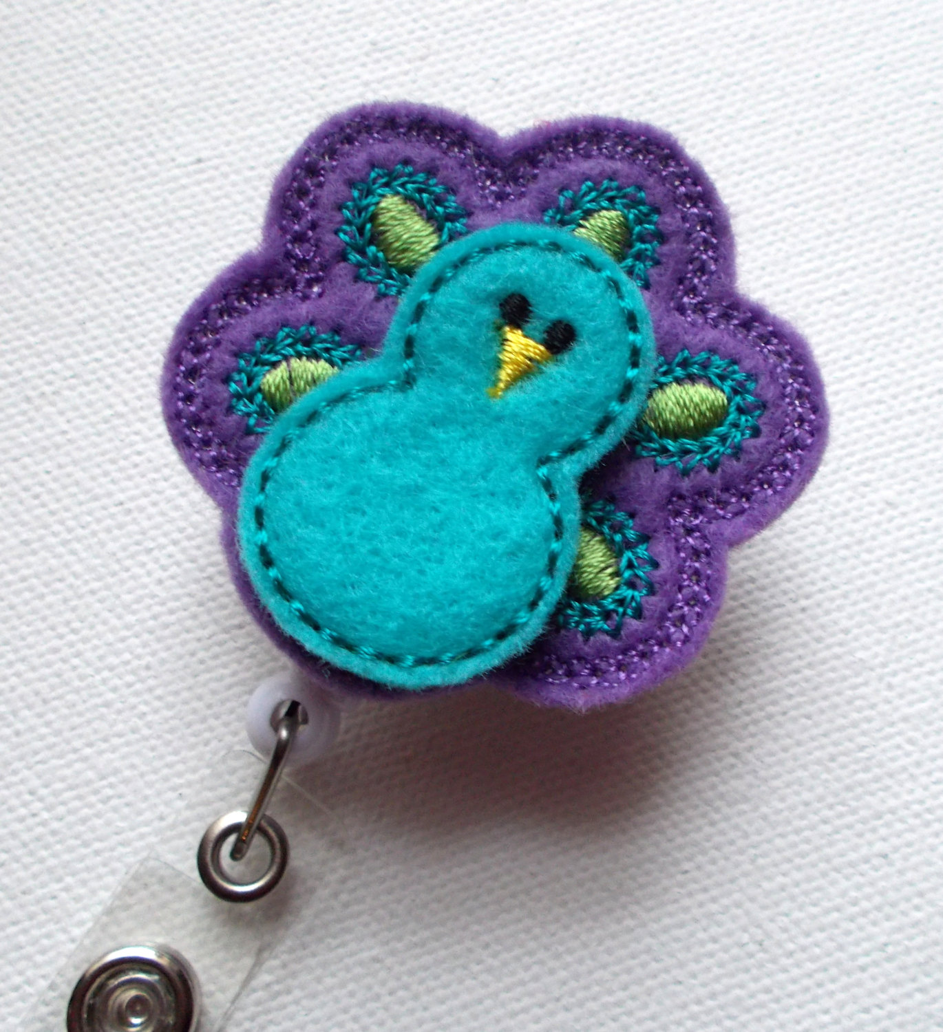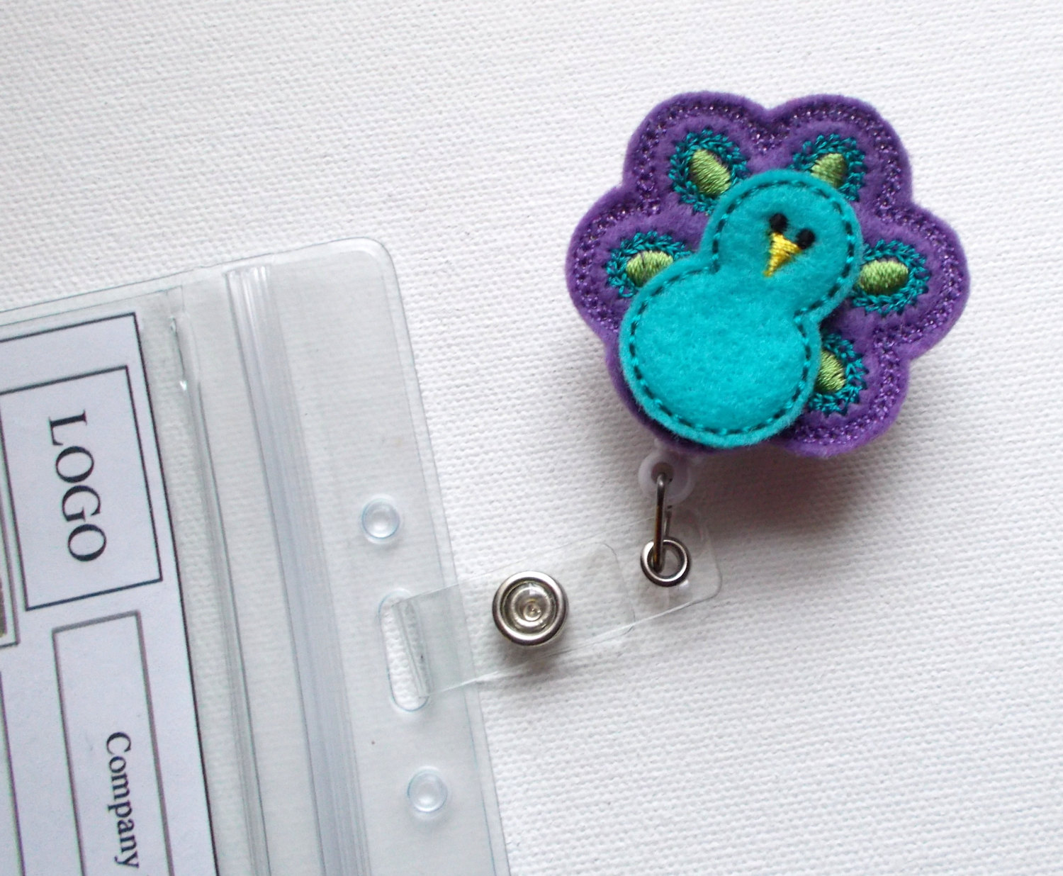 This retractable ID felt badge holder features a blue and purple peacock felt applique.