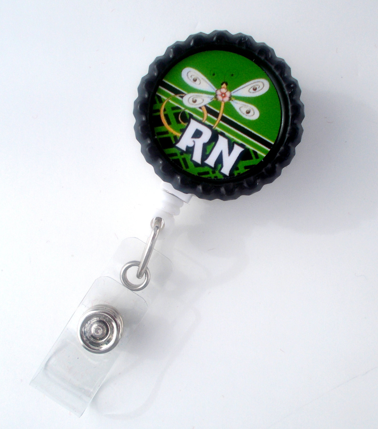 This badge reel features the initials RN with a dragonflyabove, green background. Graphic is sealed with an epoxy sealant and is glued to a black bottle cap. Sits on a sturdy white plastic badge reel.