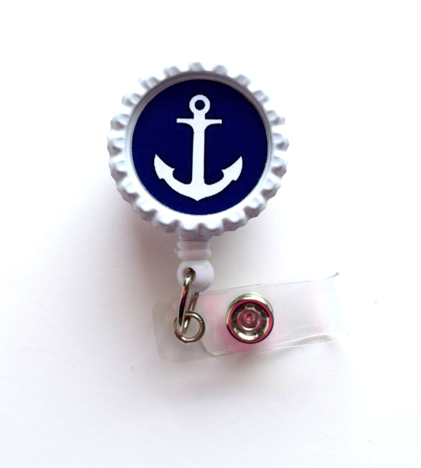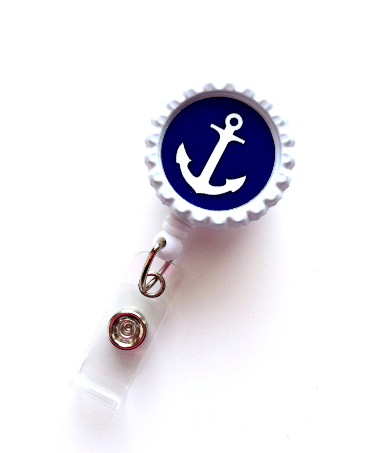 This ID Badge holder features a navy blue anchor which sits on a white bottle cap. Perfect for anyone going on a cruise!