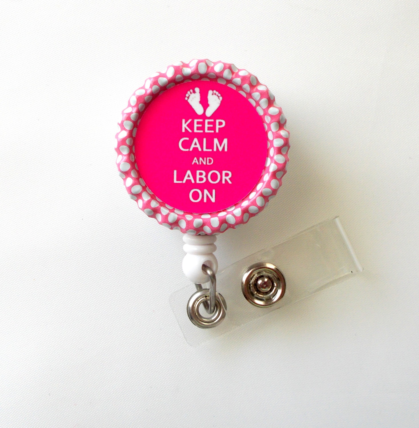 This ID Badge holder features Keep Calm and Labor On in a white font. Accented by baby feet above the wording. Pink graphic sits on a pink and white polka dot bottle cap. Super cute and sure to brighten your day!