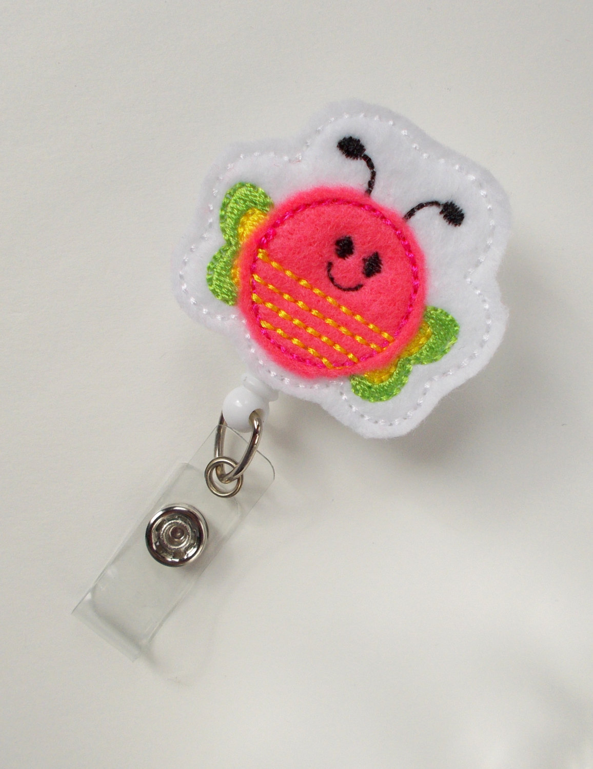 This retractable ID felt badge holder features a smiling butterfly felt applique. Sits on a white, hard plastic badge reel.