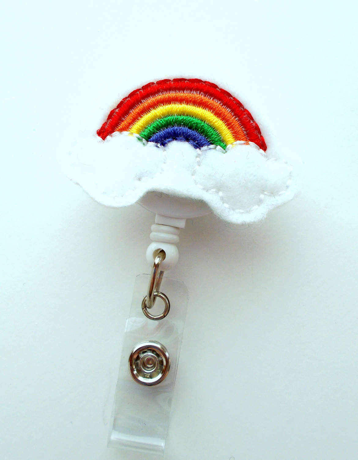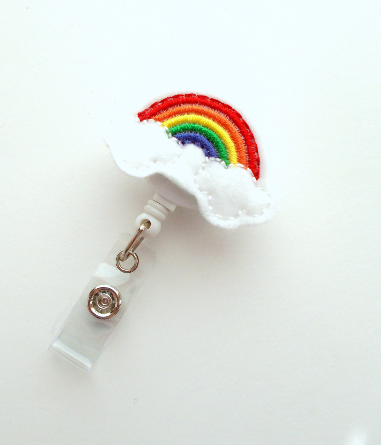 This retractable ID felt badge holder features a rainbow and cloud felt applique.