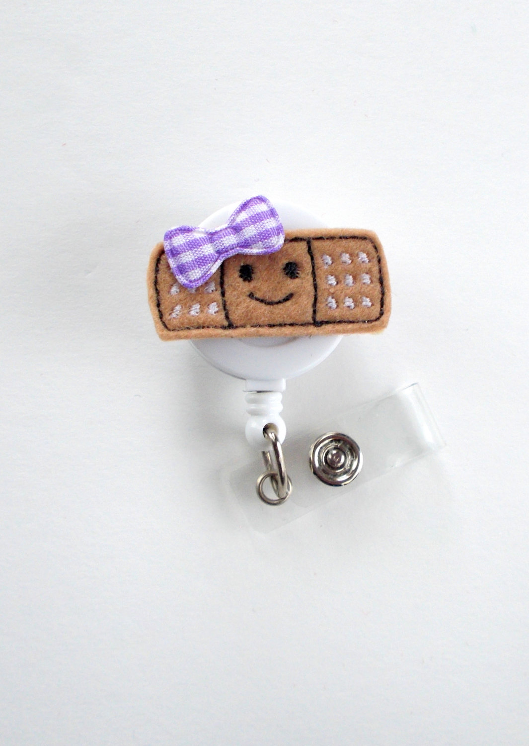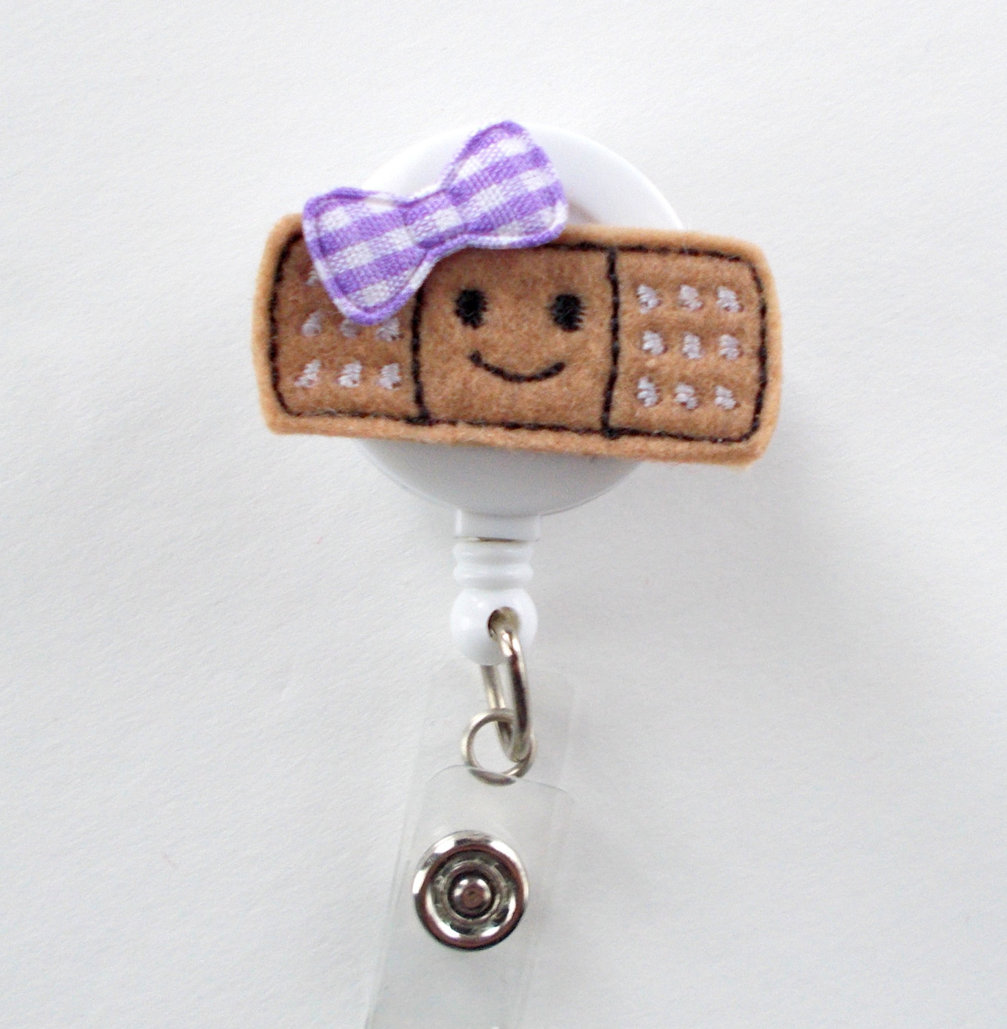 This retractable ID felt badge holder features a smiling bandaid felt applique It can be accented with a purple and white gingham checked bow. Sits on a white, hard plastic badge reel.
