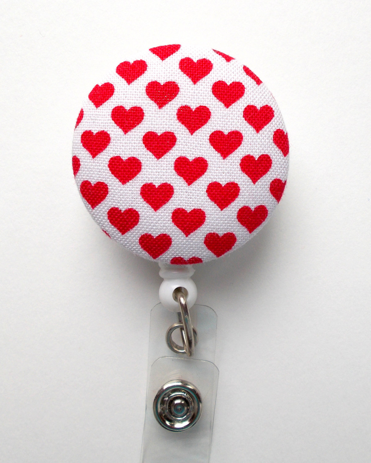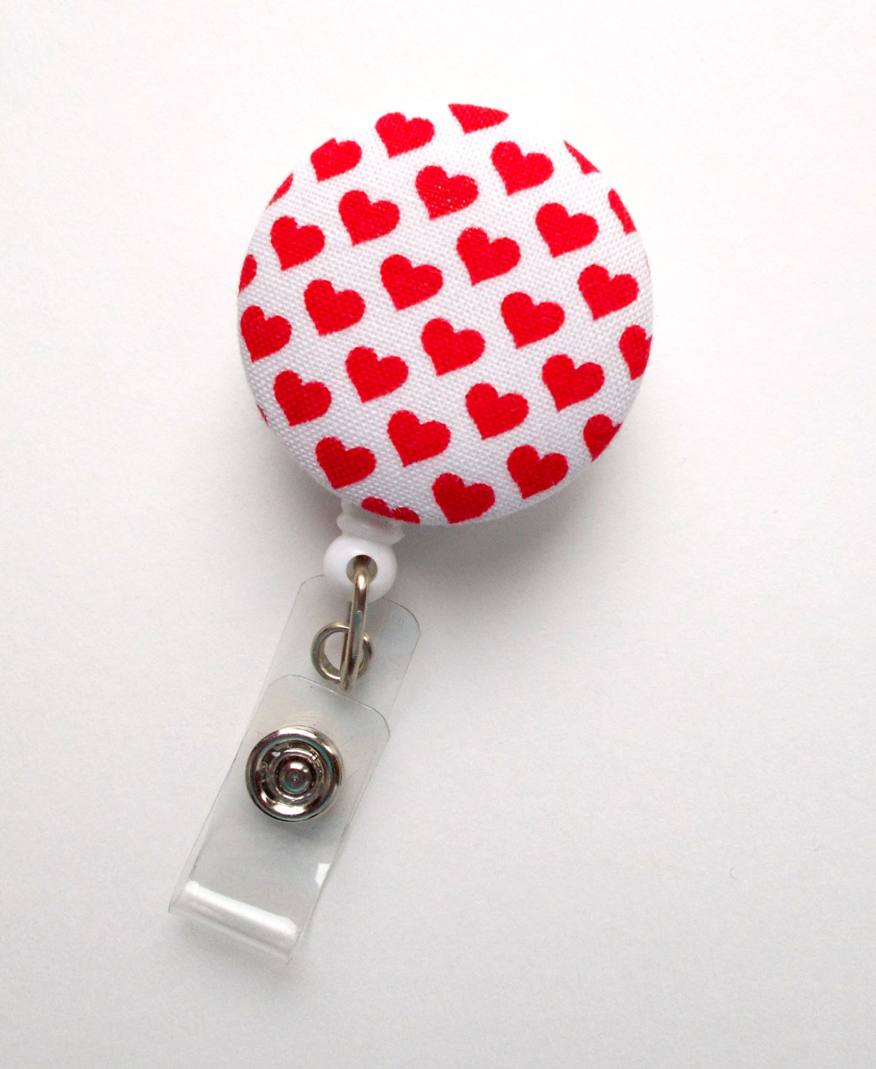 This retractable ID felt badge holder features red and white hearts fabric covered button. Sits on a white badge holder.