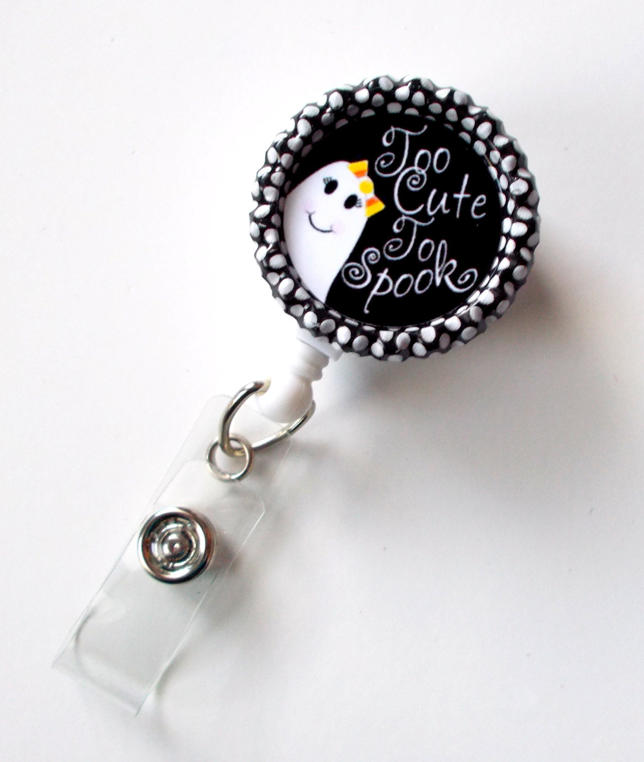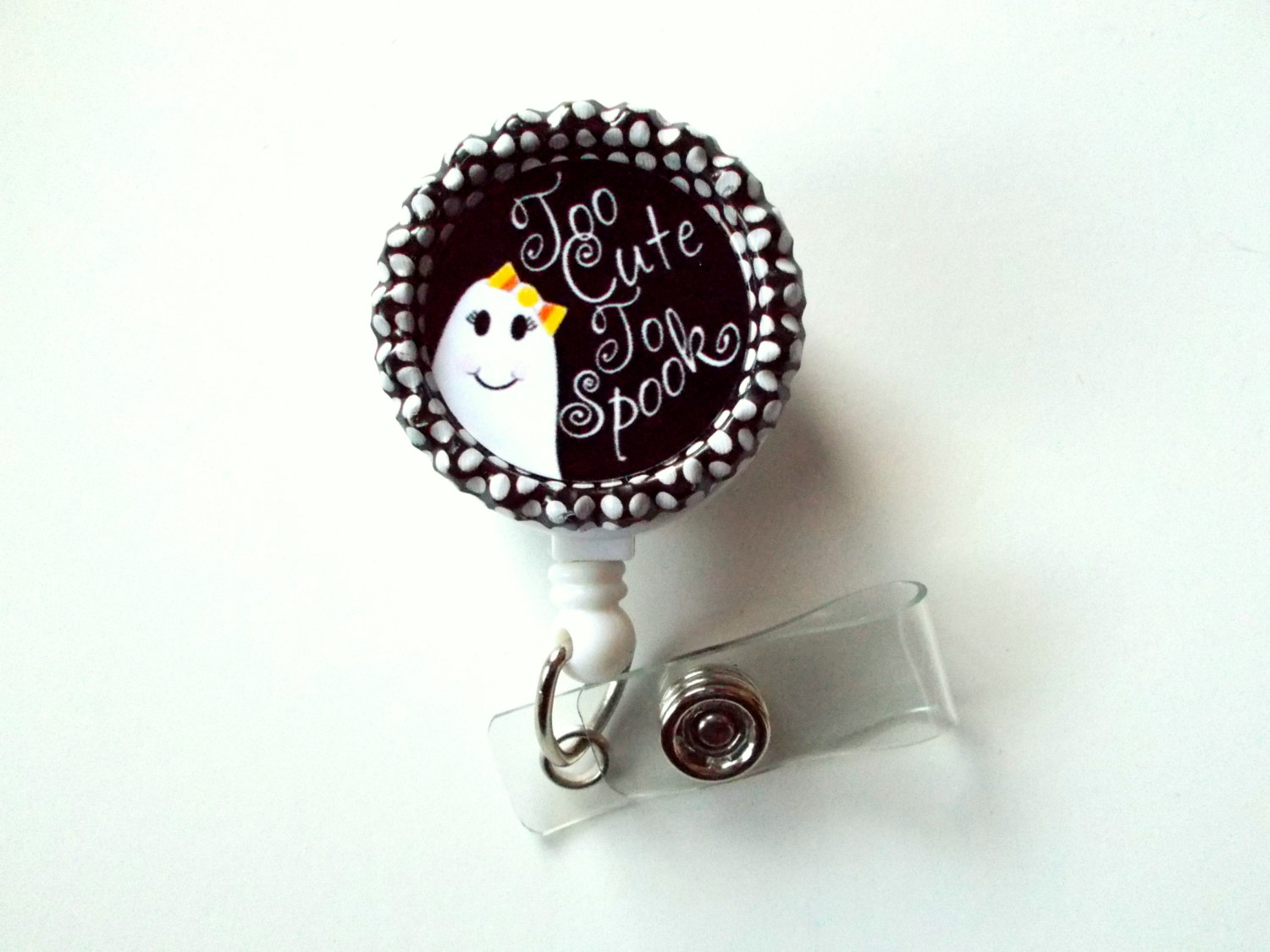 This ID Badge holder features a ghost and the phrase "Too Cute to Spook." Graphic is sealed with an epoxy sealant. Sits on a black and white bottle cap. Bottle cap is glued to a white, hard plastic badge reel.