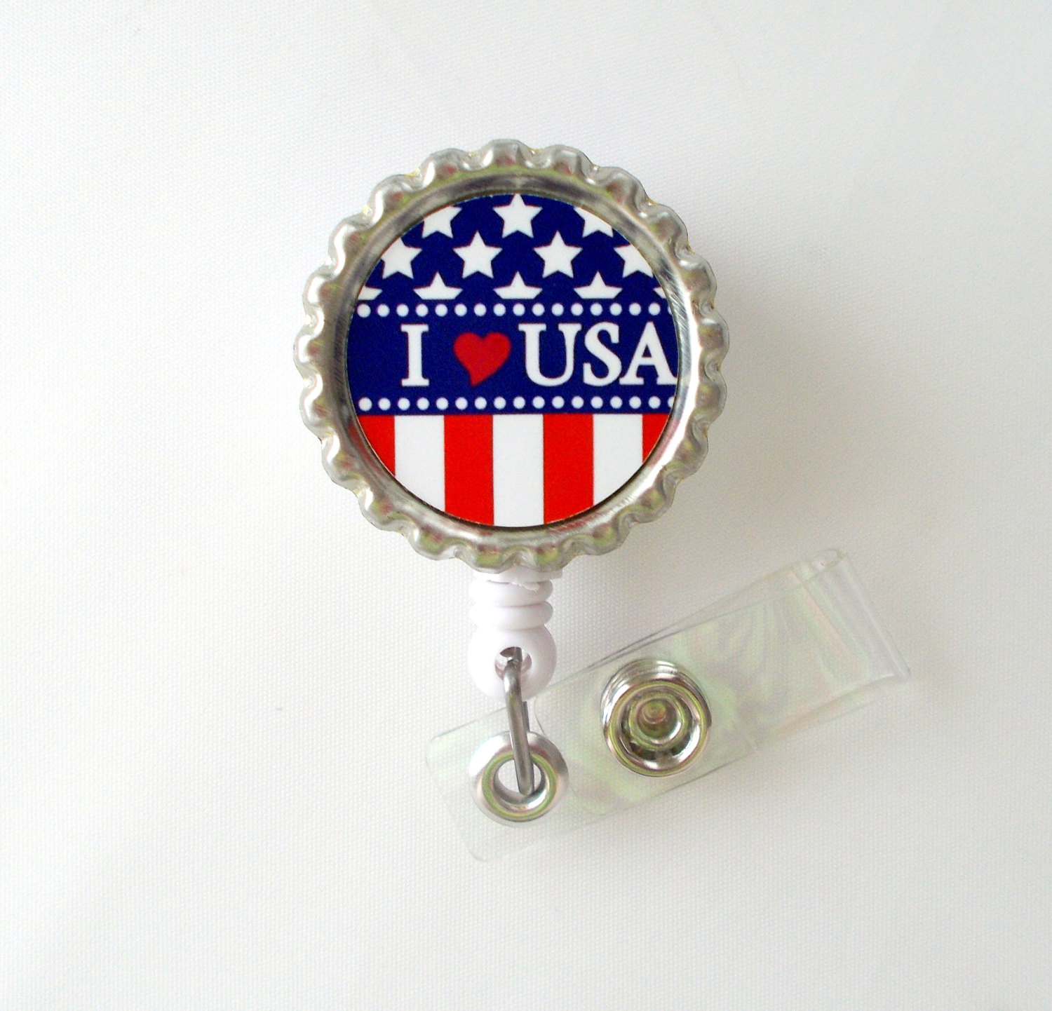 American Flag - I Love USA - ID Badge Holder - Badge Reel - Name Badge Holder - Bottle Cap Badge - Nursing Badge - Nurses Badge Holder