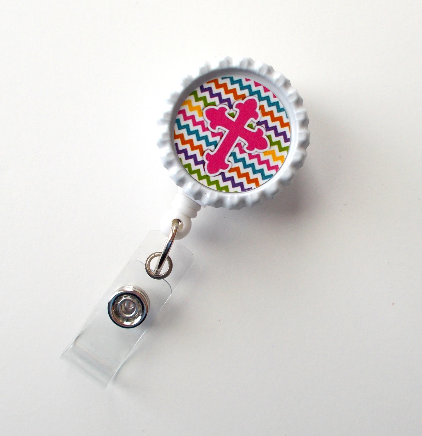 This ID Badge holder features a blue cross on a colorful chevron background. Sits on a blue bottle cap. Graphic is sealed with an epoxy sealant. The badge reel is a white hard plastic reel.