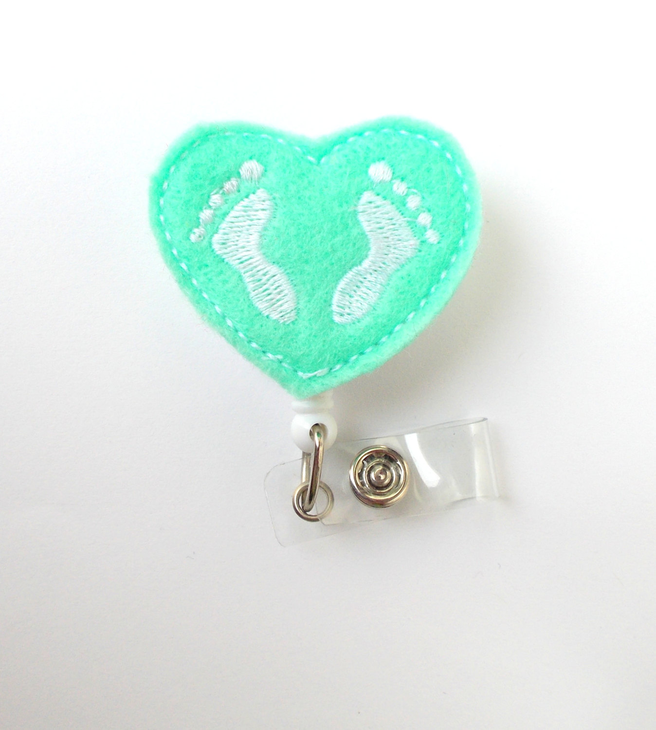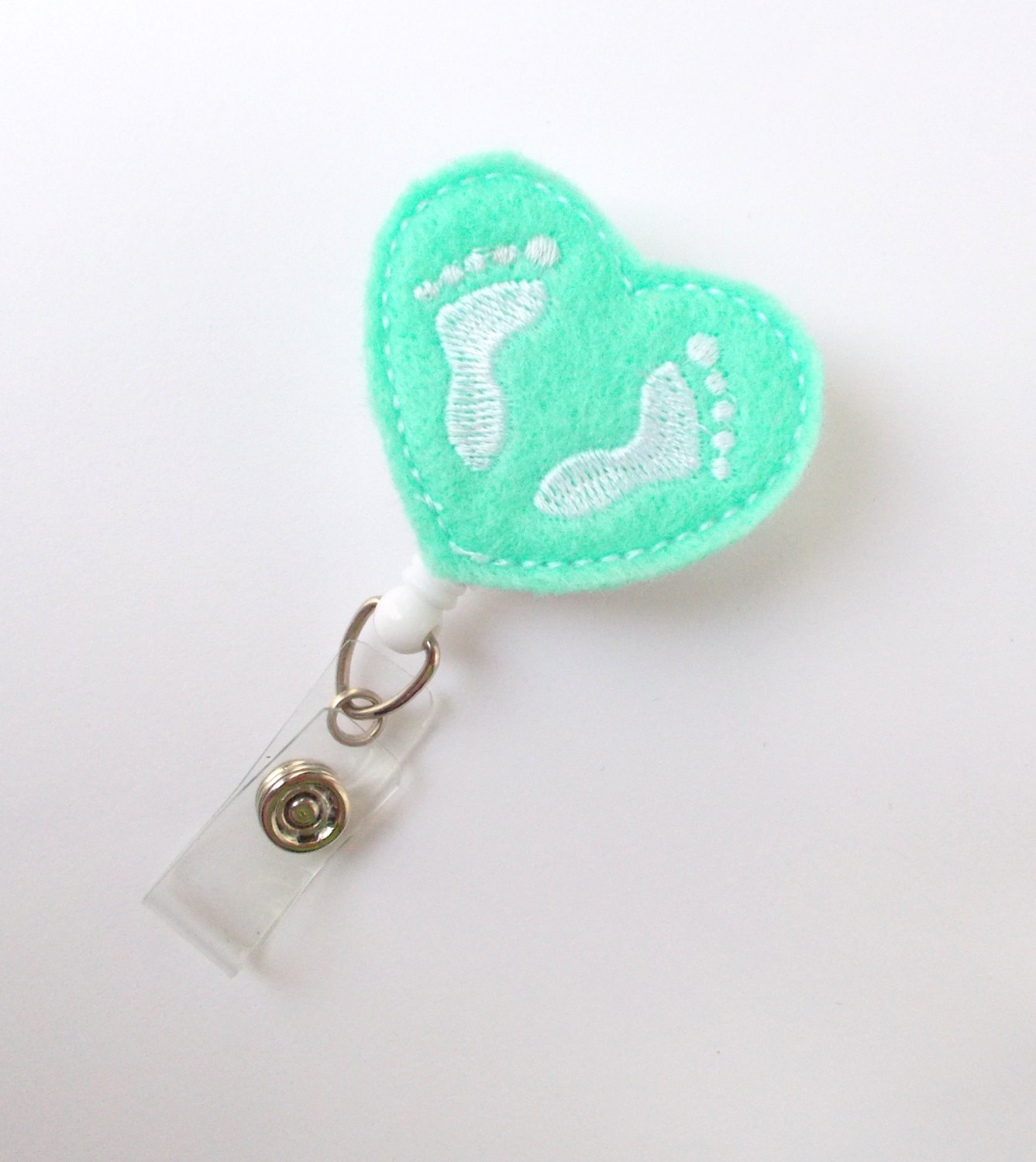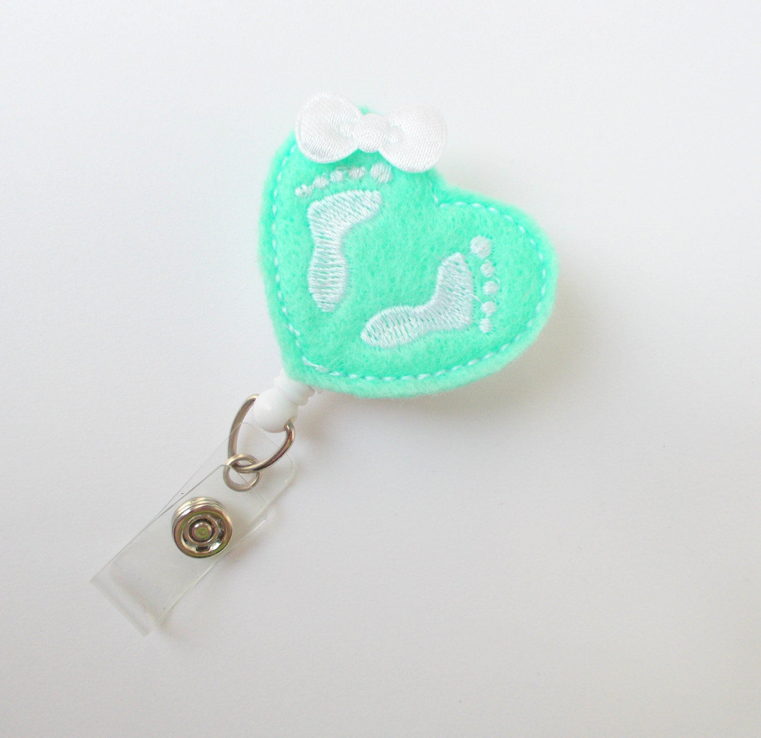 This retractable ID felt badge holder features a felt applique mint heart featuring white baby feet in the middle of the heart. May be accented with a white bow. Sits on a white, hard plastic badge reel.
