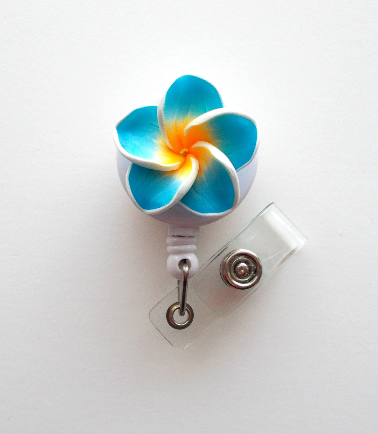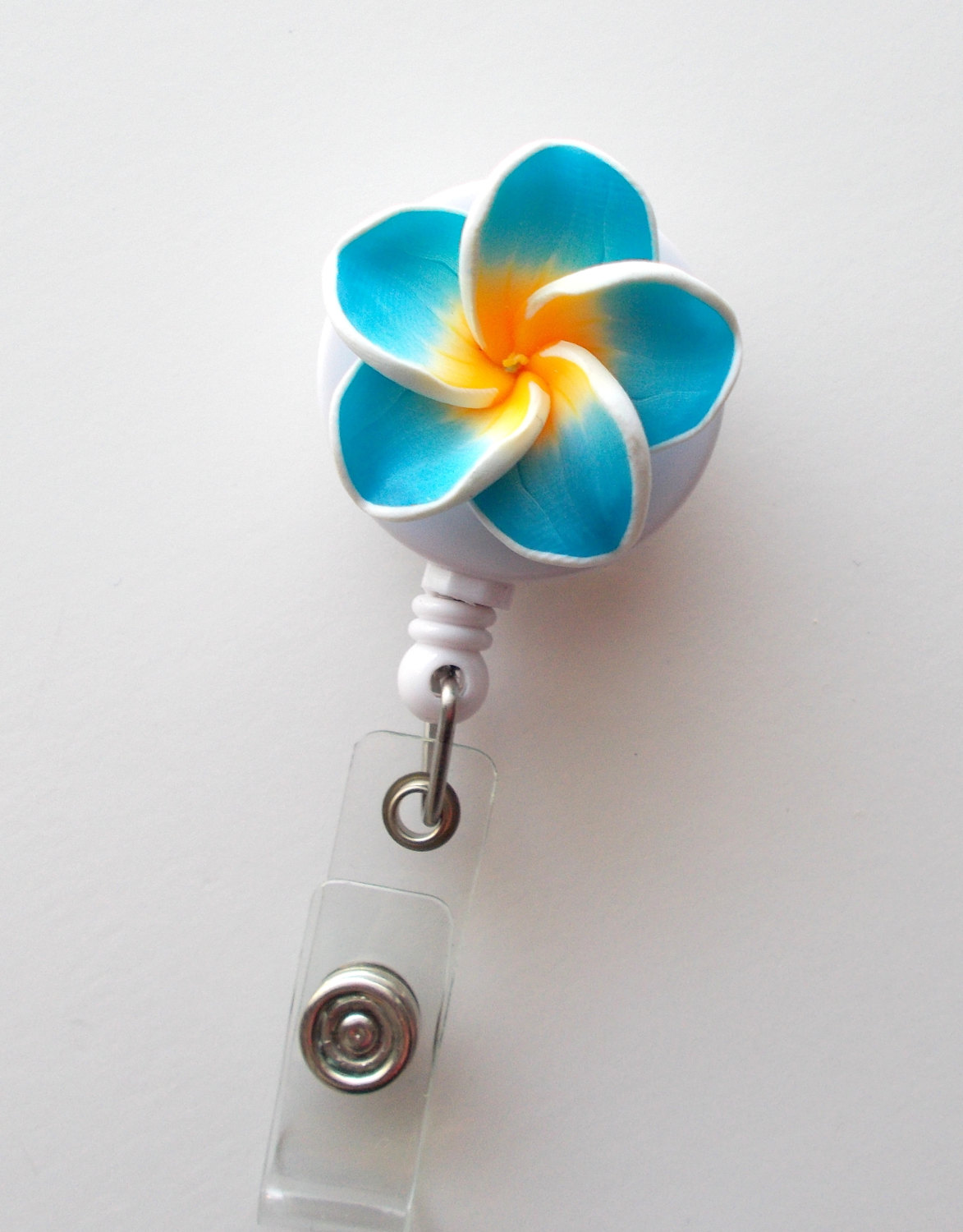 This badge features an aqua blue plumeria polymer clay flower. Sits on a white, hard plastic badge holder.