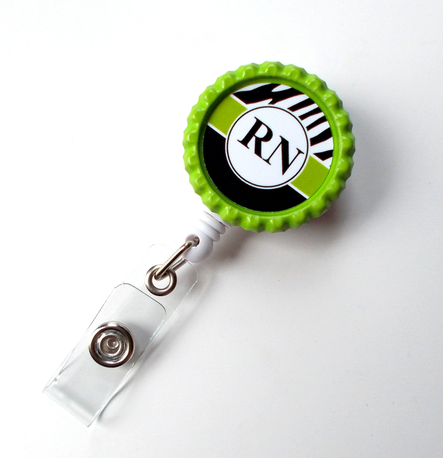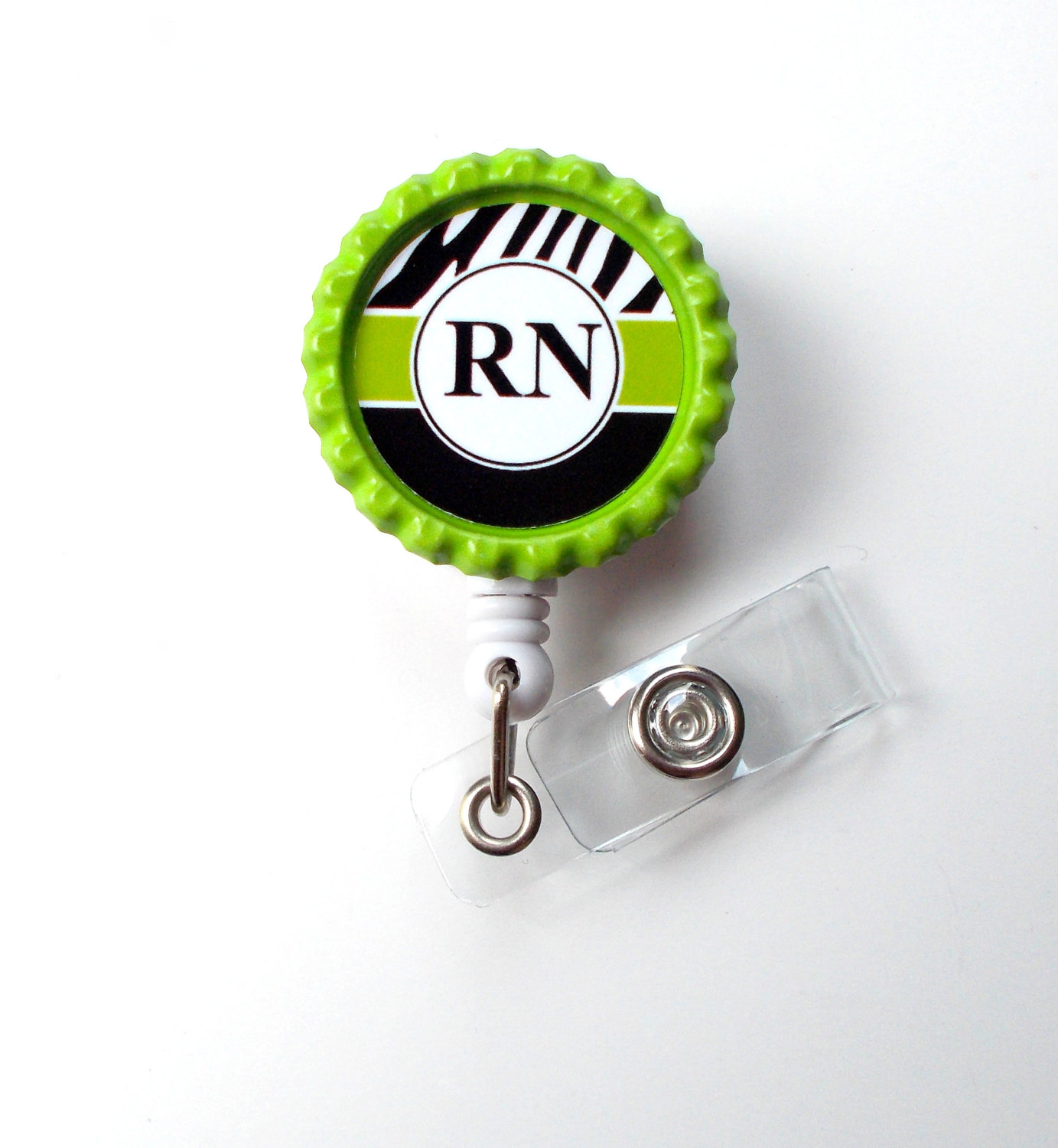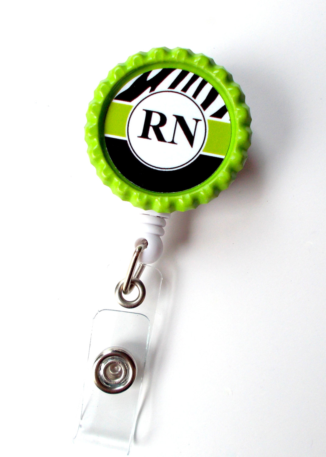 RN Lime Green Zebra ID Badge holder set on a lime green bottle cap.