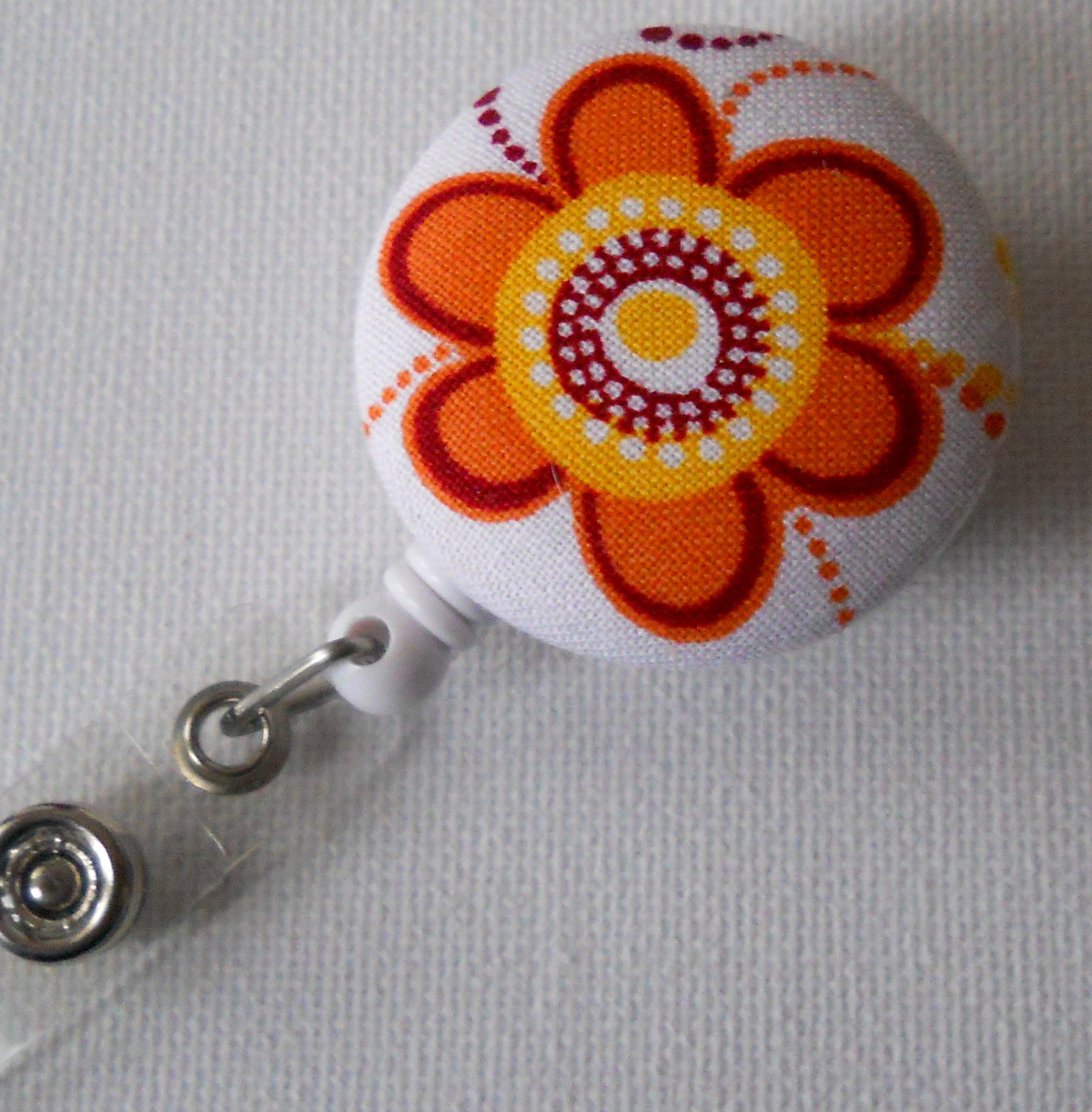 Orange Flower ID Badge Reel from fabric covered buttons.