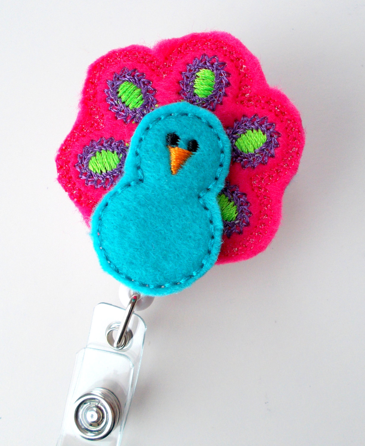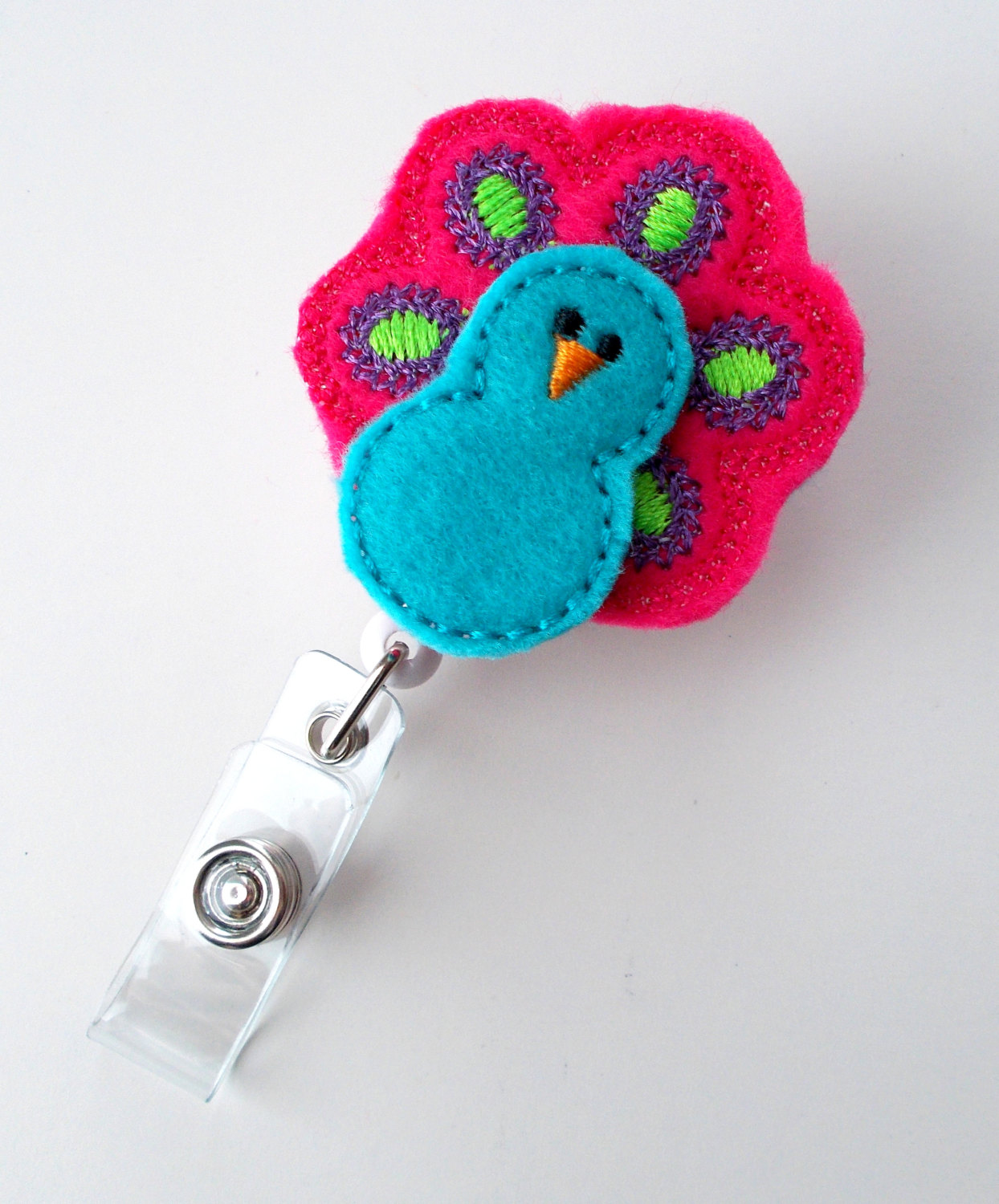 This retractable ID felt badge holder features a blue and pink peacock felt applique.