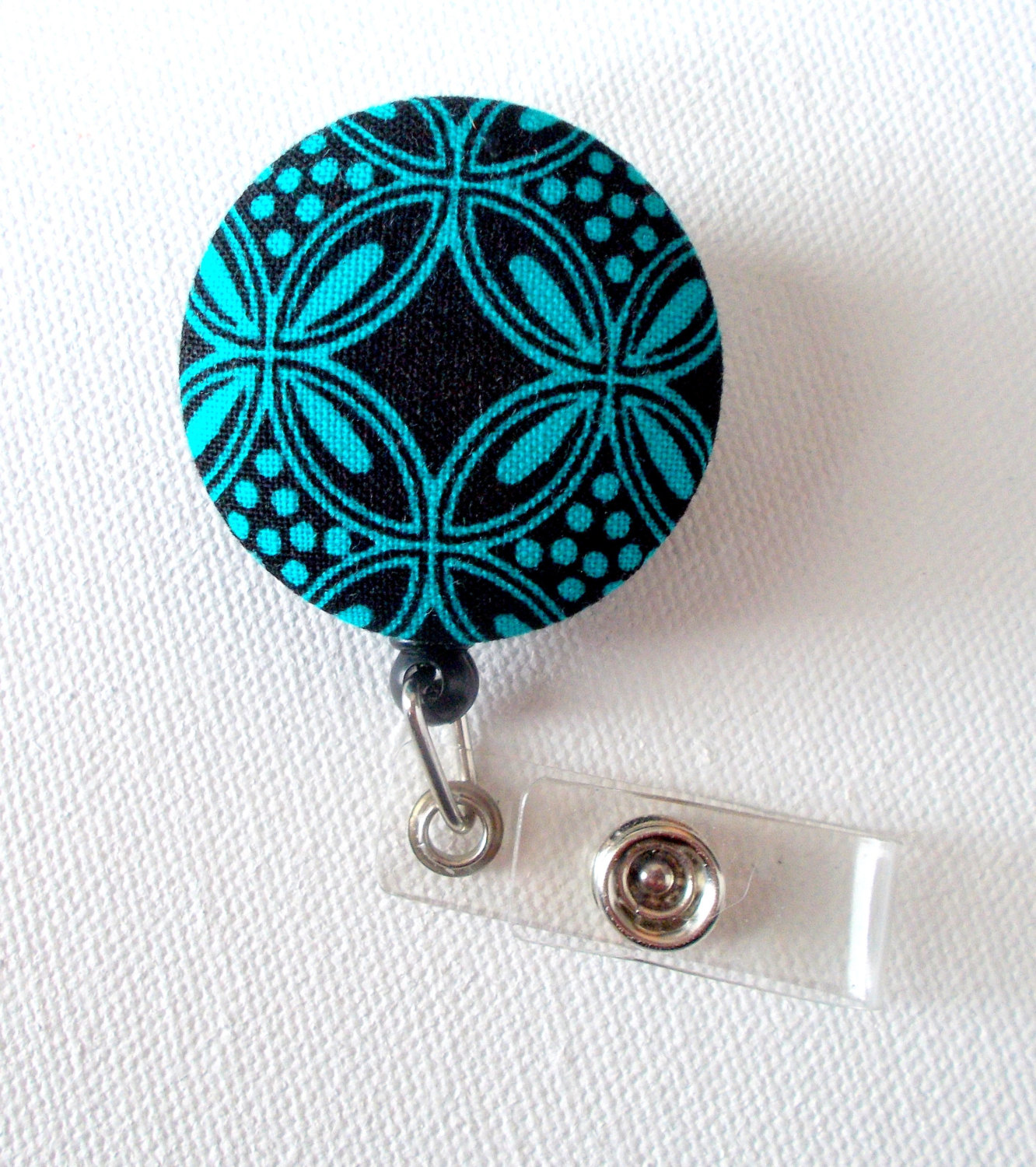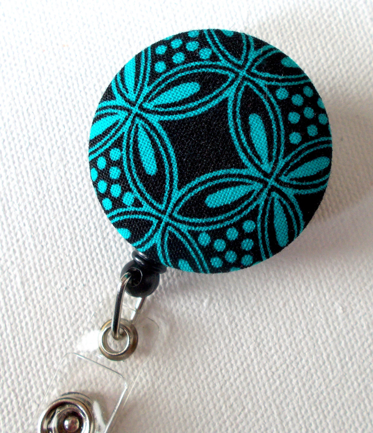 This ID badge holder features a fabric covered button accented with an aqua diamond pattern. Sits on a hard plastic badge reel. Can choose either black or white badge reel.