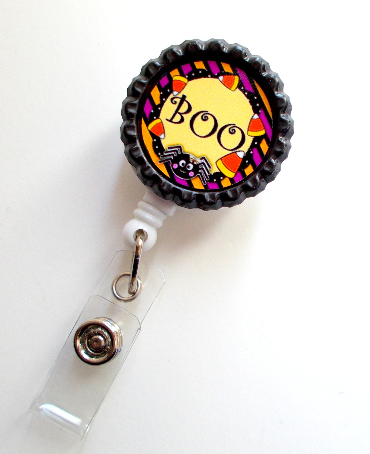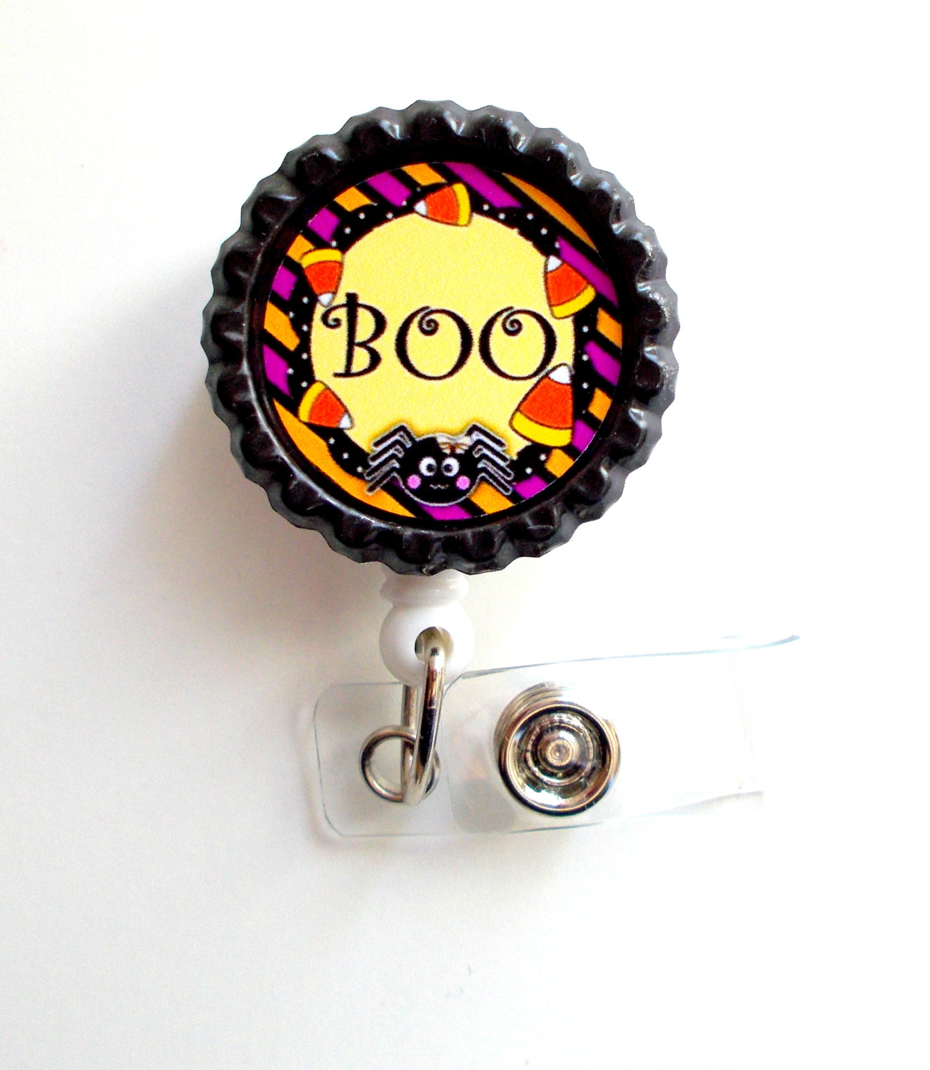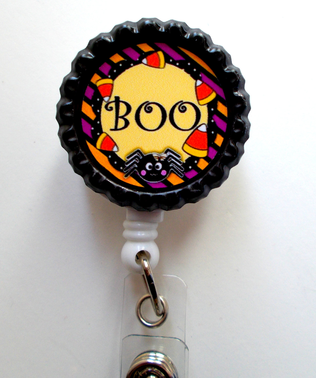 This ID Badge holder features the word BOO! surrounded by candy corn and a spider. Graphic is sealed with an epoxy sealant. Sits on a black bottle cap. Bottle cap is glued to a white, hard plastic badge reel.