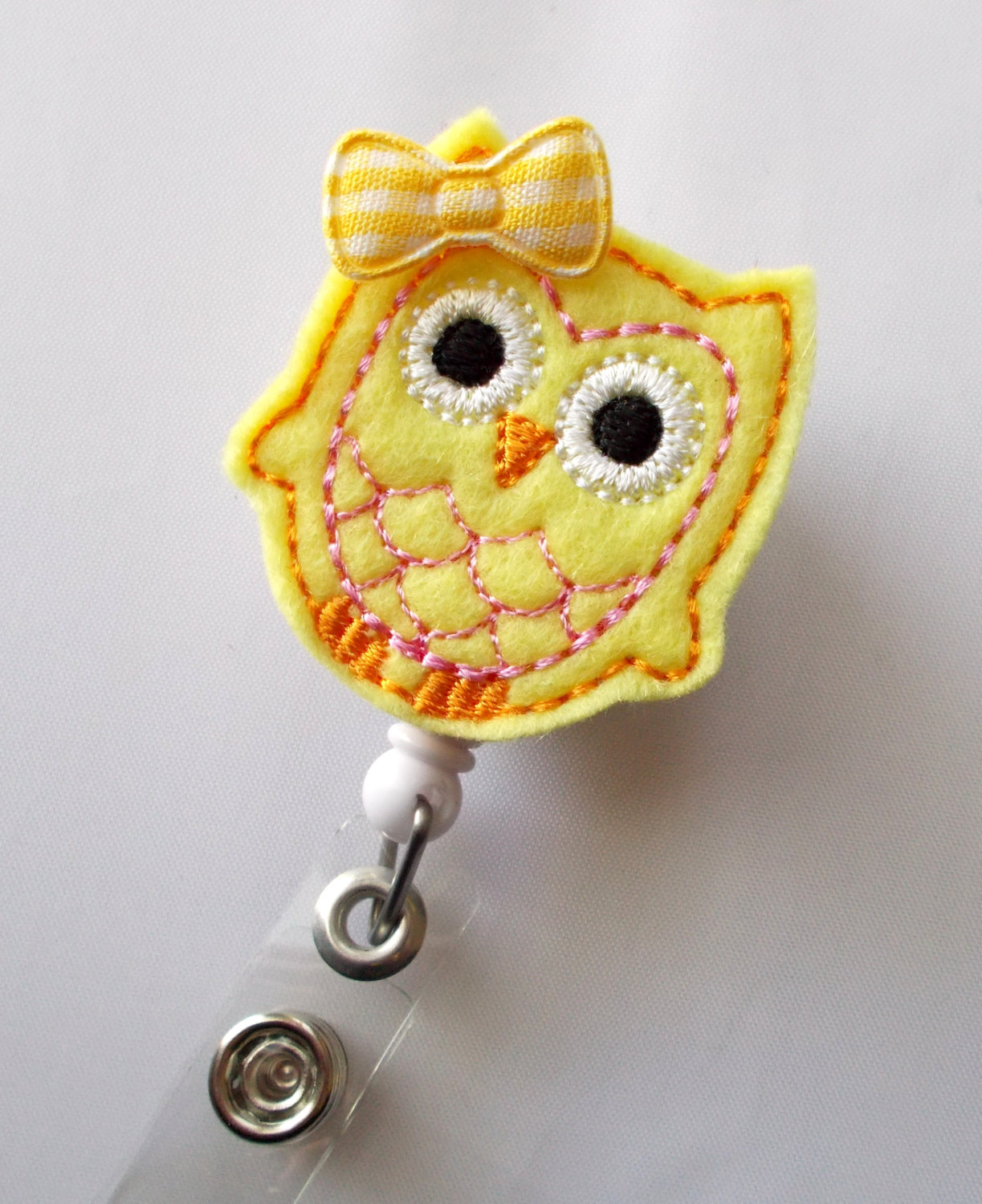 This retractable ID felt badge holder features a yellow owl felt applique, accented with a gingham checked yellow and white bow.
