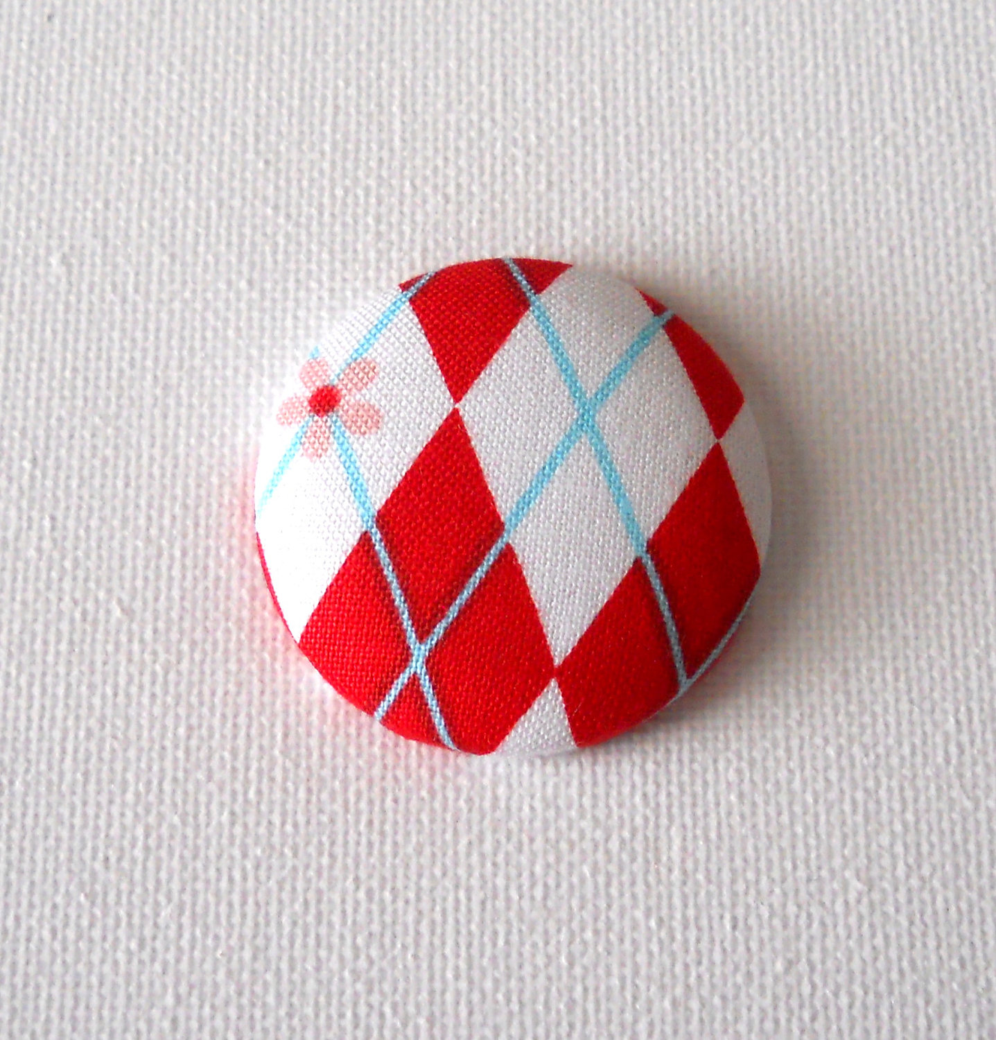 This adorable retractable ID badge reel was handmade from my fabric covered buttons. Fabric features a red and white argyle pattern with a pink floral accent.