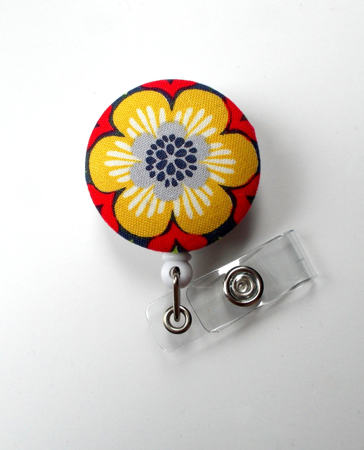 This ID badge reel features floral pattern. Colors include: red, yellow and gray.