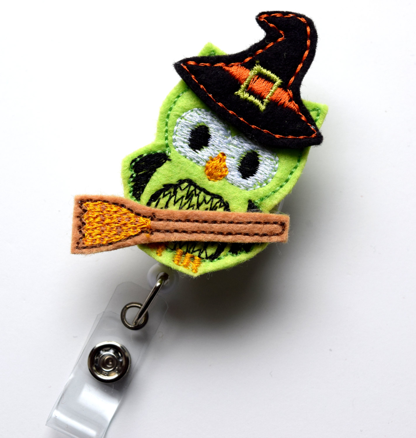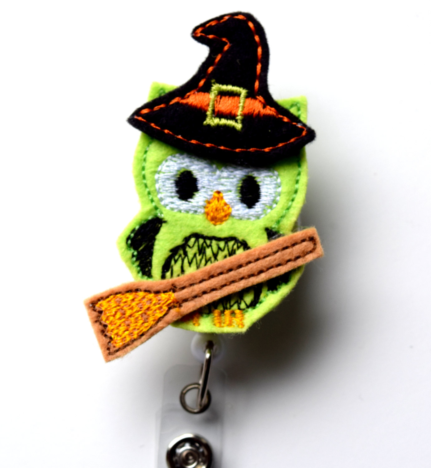 This retractable ID felt badge holder features a witch owl felt applique, accented with a witch hat and broom. Sits on a sturdy white plastic badge reel.