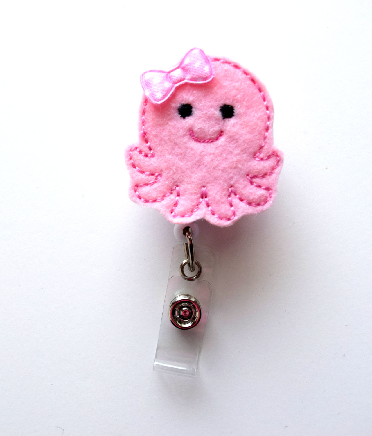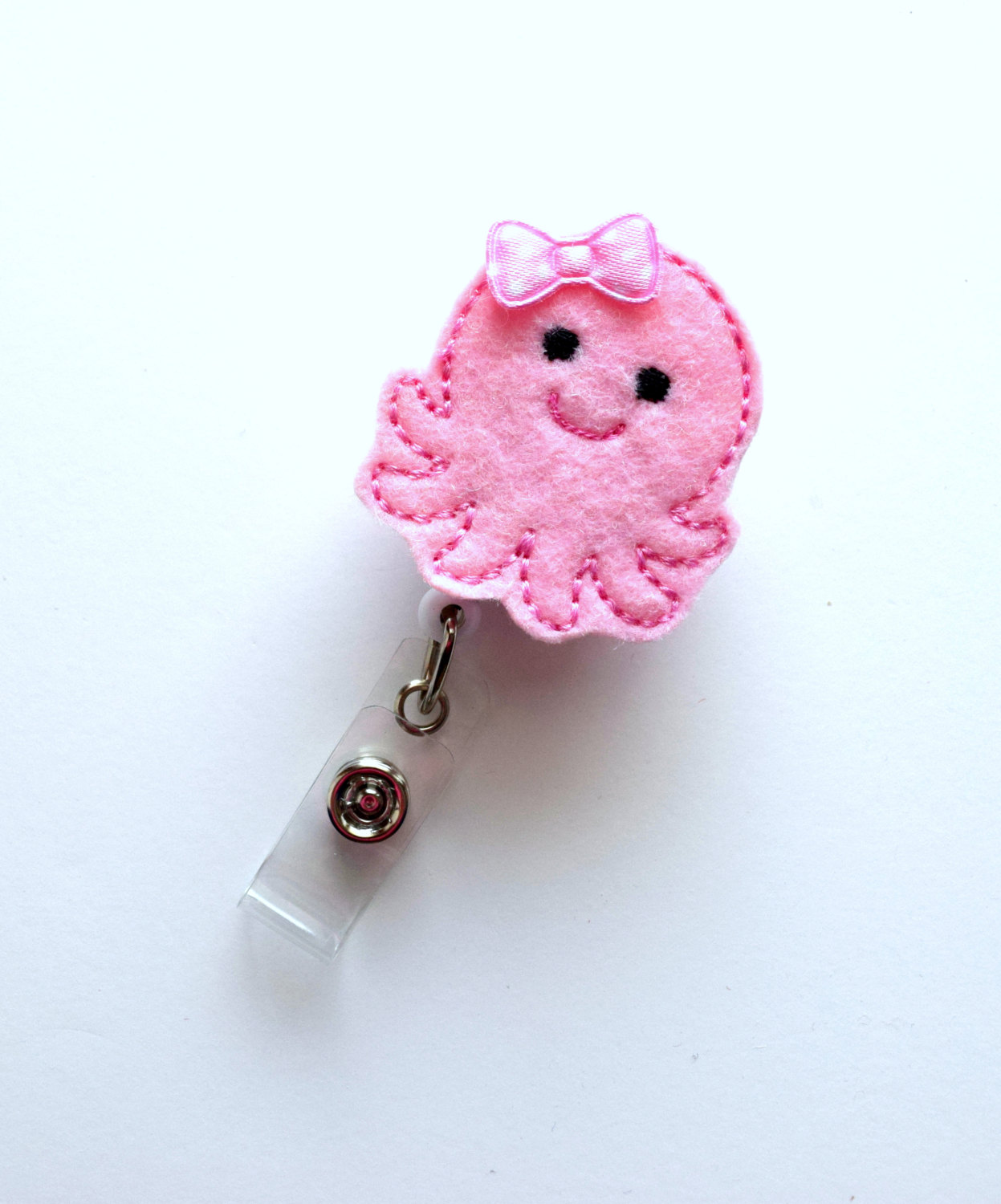 This retractable ID felt badge holder features a pink octopus felt applique, accented with a pink polka dot bow. Sits on a white badge reel.