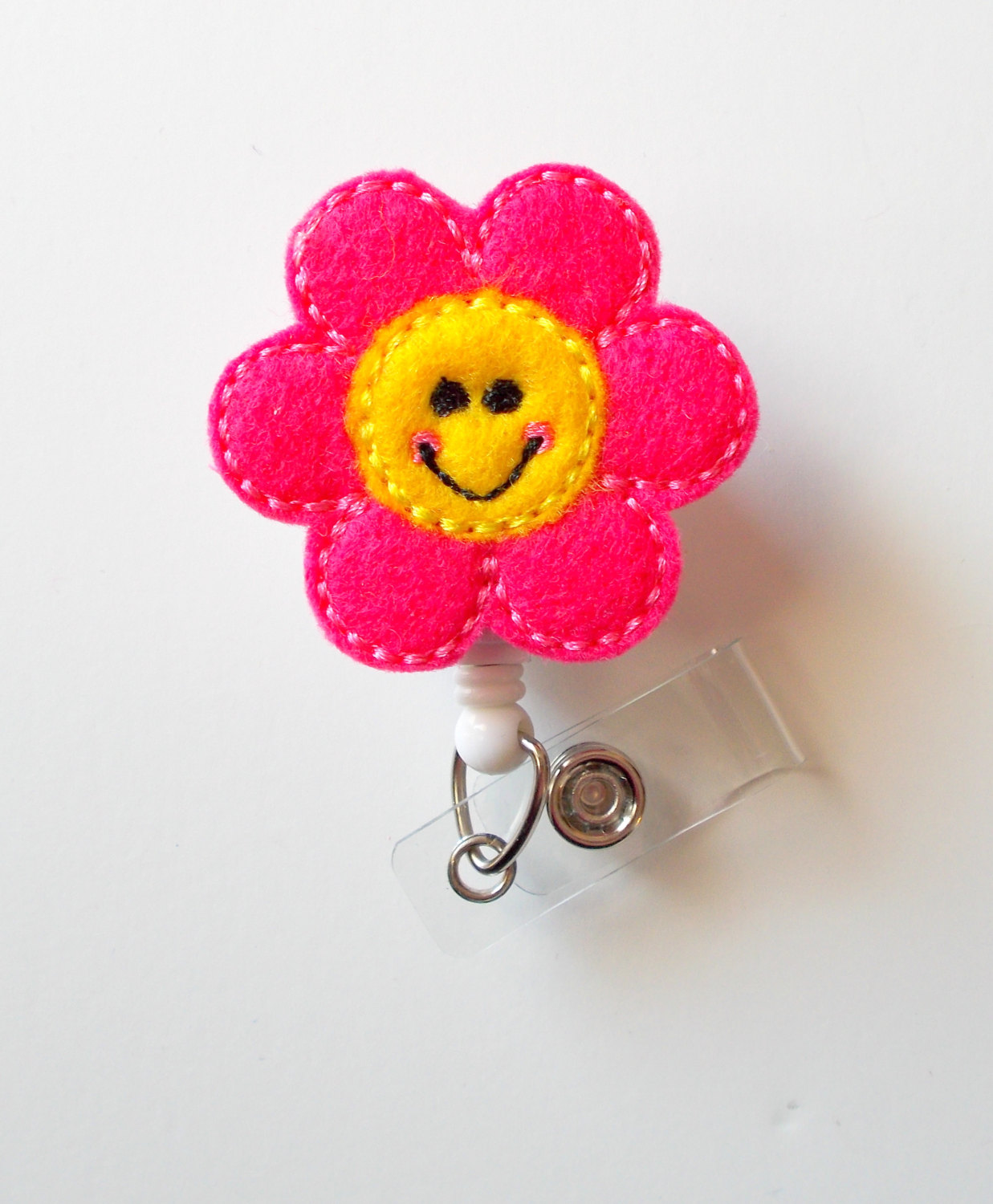 This retractable ID felt badge holder features a happy flower felt applique. Bright pink and yellow are featured in this feltie. Sits on a white hard plastic badge reel.
