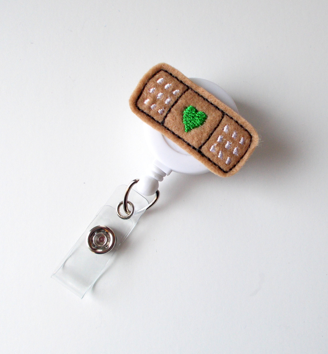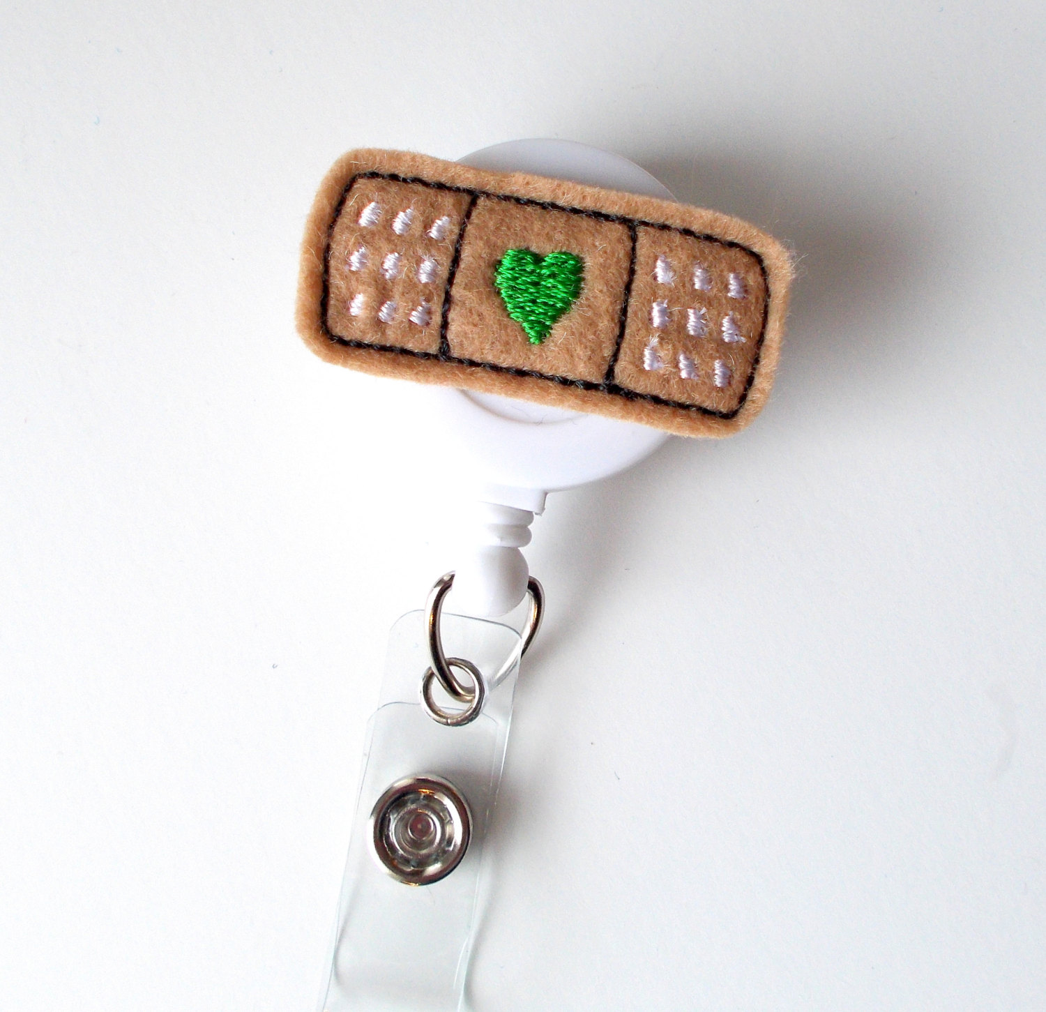 This retractable ID felt badge holder features a band-aid felt applique, accented with a green heart. Sits on a white badge reel.