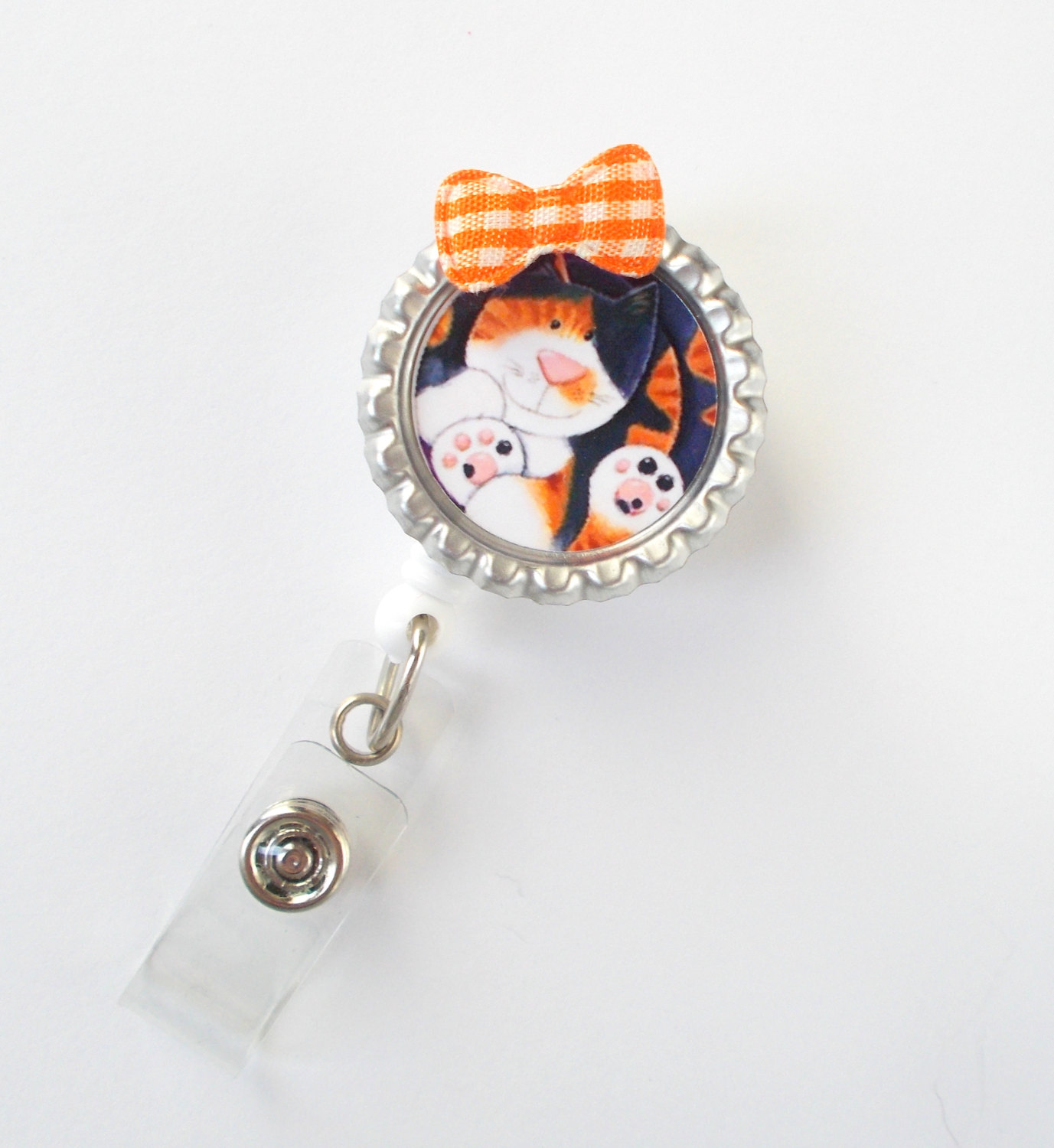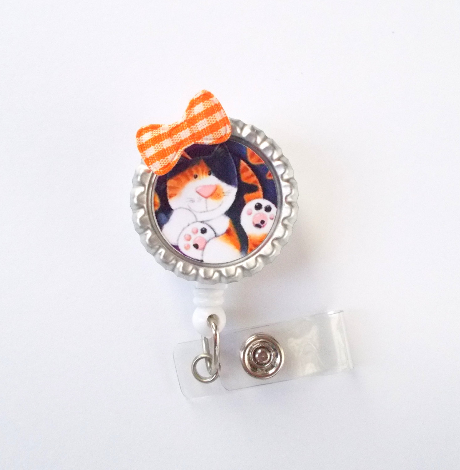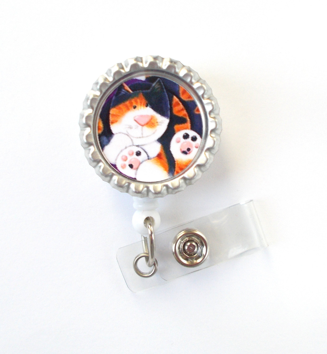This retractable ID felt badge holder features a calico cat graphic. Image is sealed with an epoxy sealant and is glued to a silver bottle cap. Bottle cap is glued to a white, hard plastic badge reel. Graphic may be wiped cleaned with a damp cloth but it is not waterproof. May be accented with an orange and white polka dot bow.