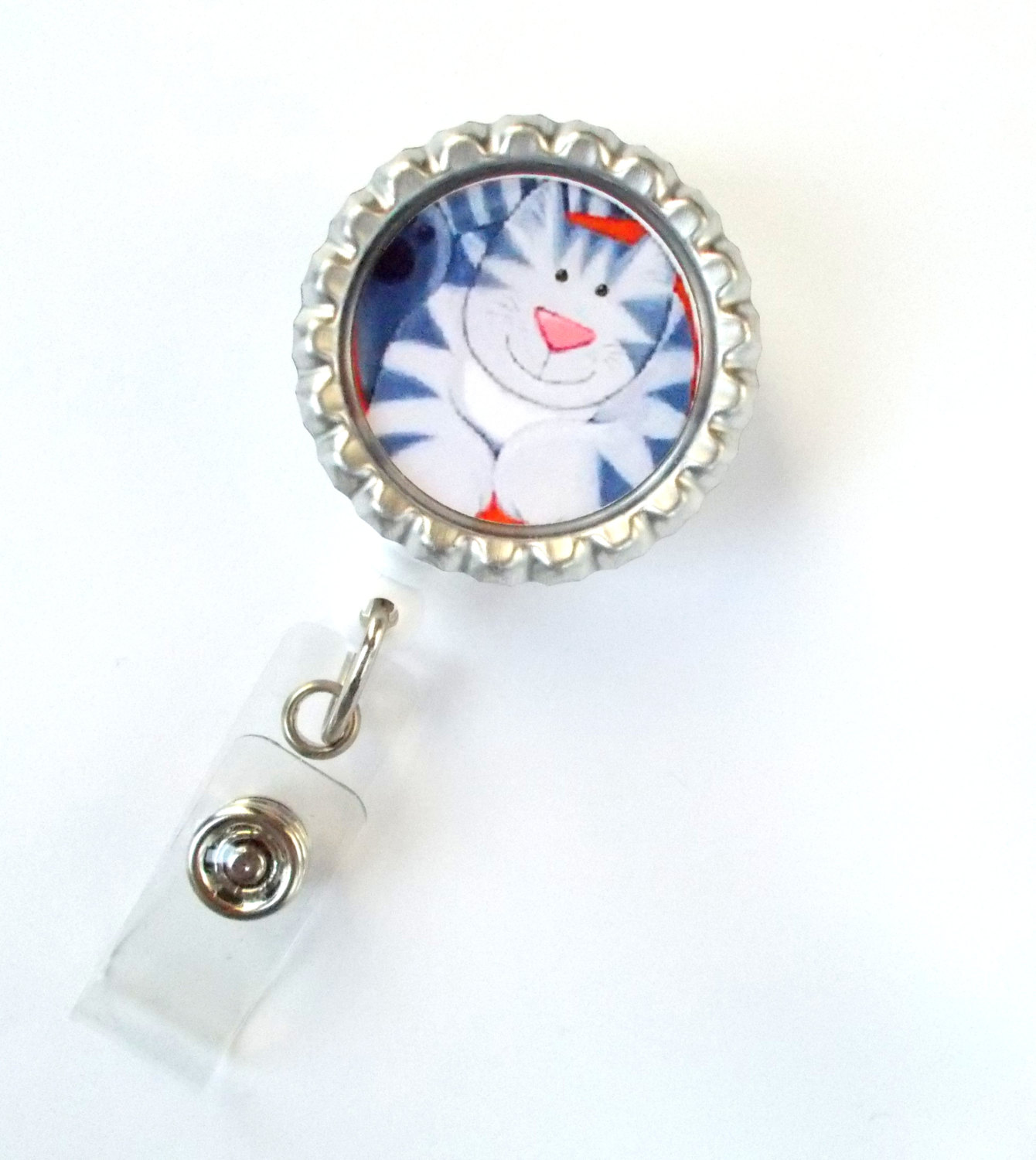 This retractable ID felt badge holder features a gray and white striped cat graphic. Image is sealed with an epoxy sealant and is glued to a silver bottle cap. Bottle cap is glued to a white, hard plastic badge reel. Graphic may be wiped cleaned with a damp cloth but it is not waterproof.
