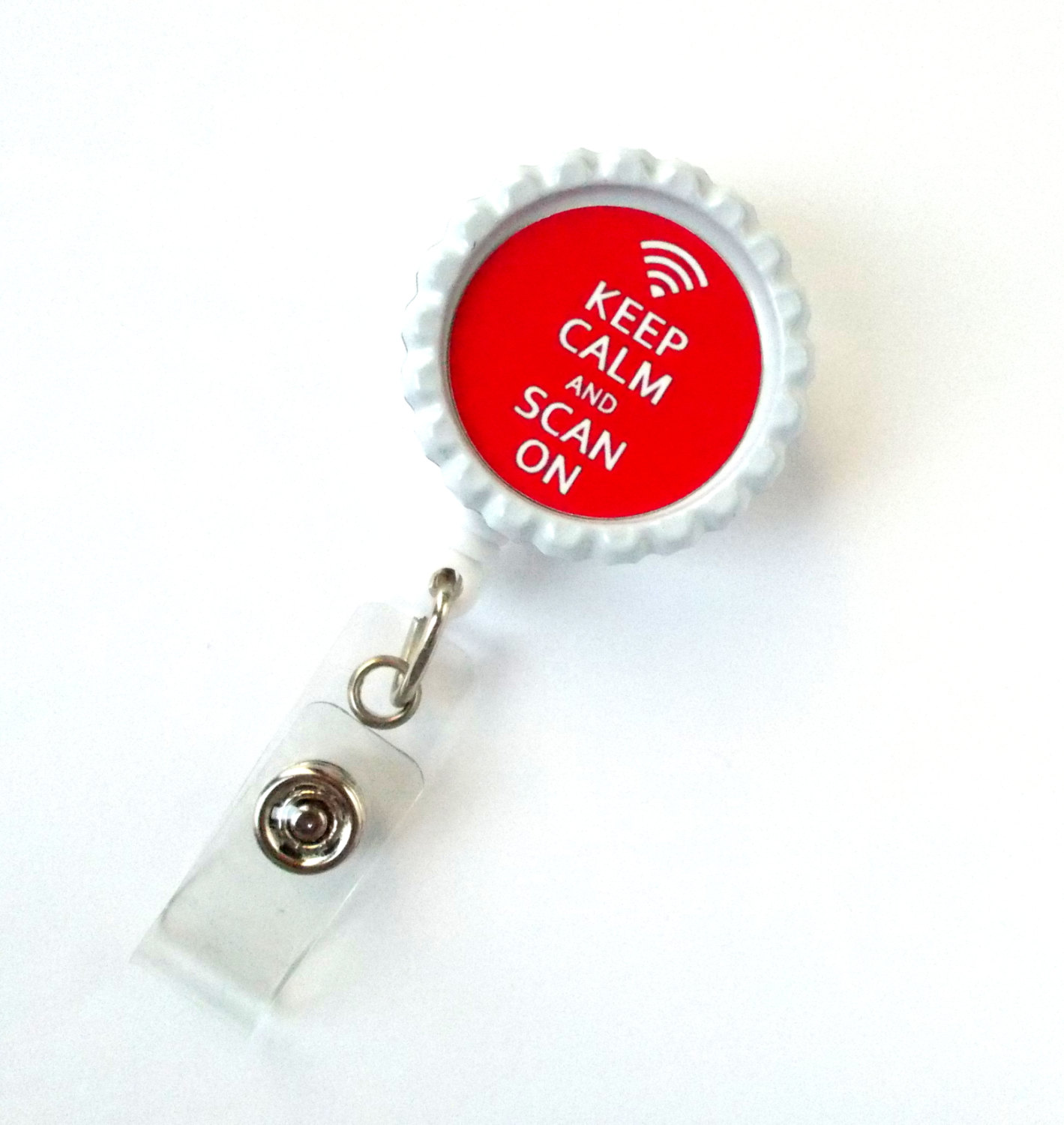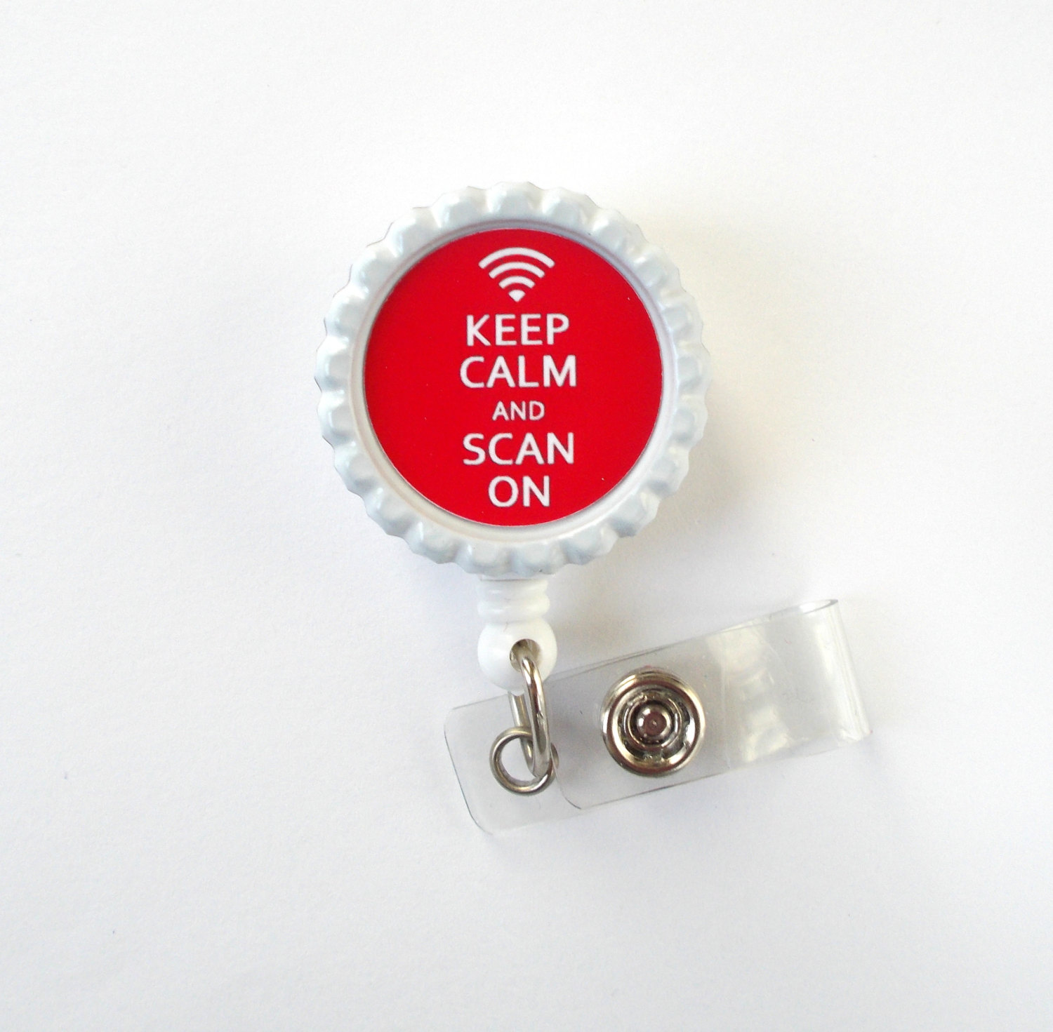 This listing features a red Keep Calm and Scan On badge reel. Graphic is sealed with an epoxy sealant and is glued to a white bottle cap. Bottle cap is attached to a white, hard plastic badge reel. Graphic may be wiped cleaned with a damp cloth but it is not waterproof.