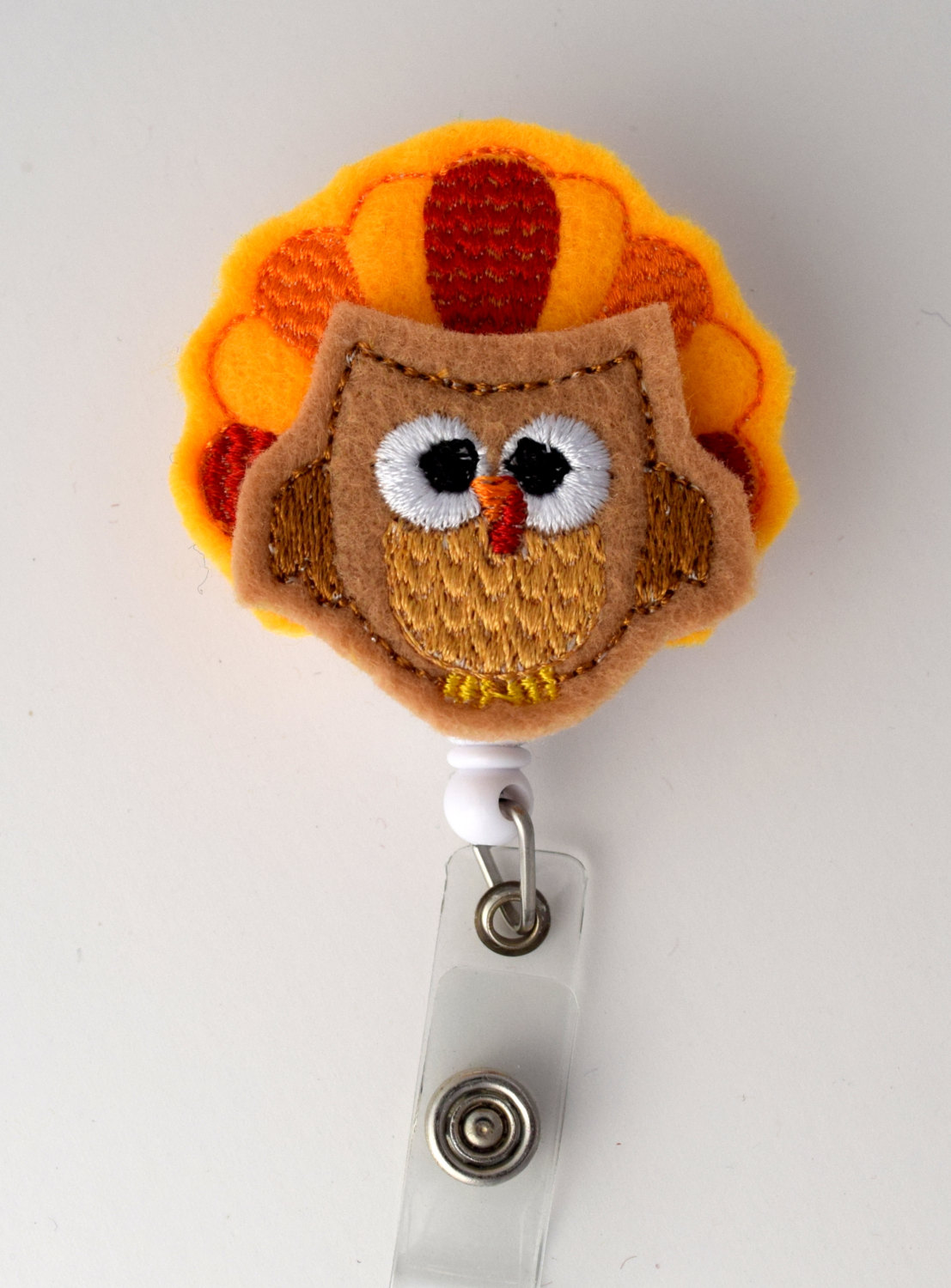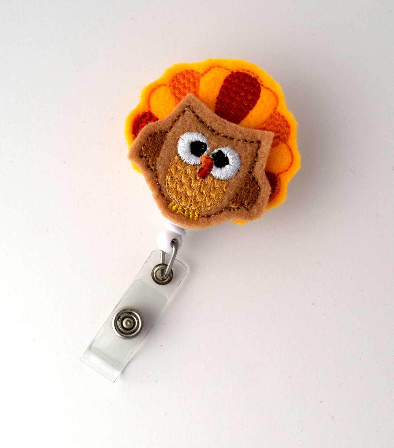 This retractable ID felt badge holder features a colorful turkey felt applique. Sits on a white badge reel.