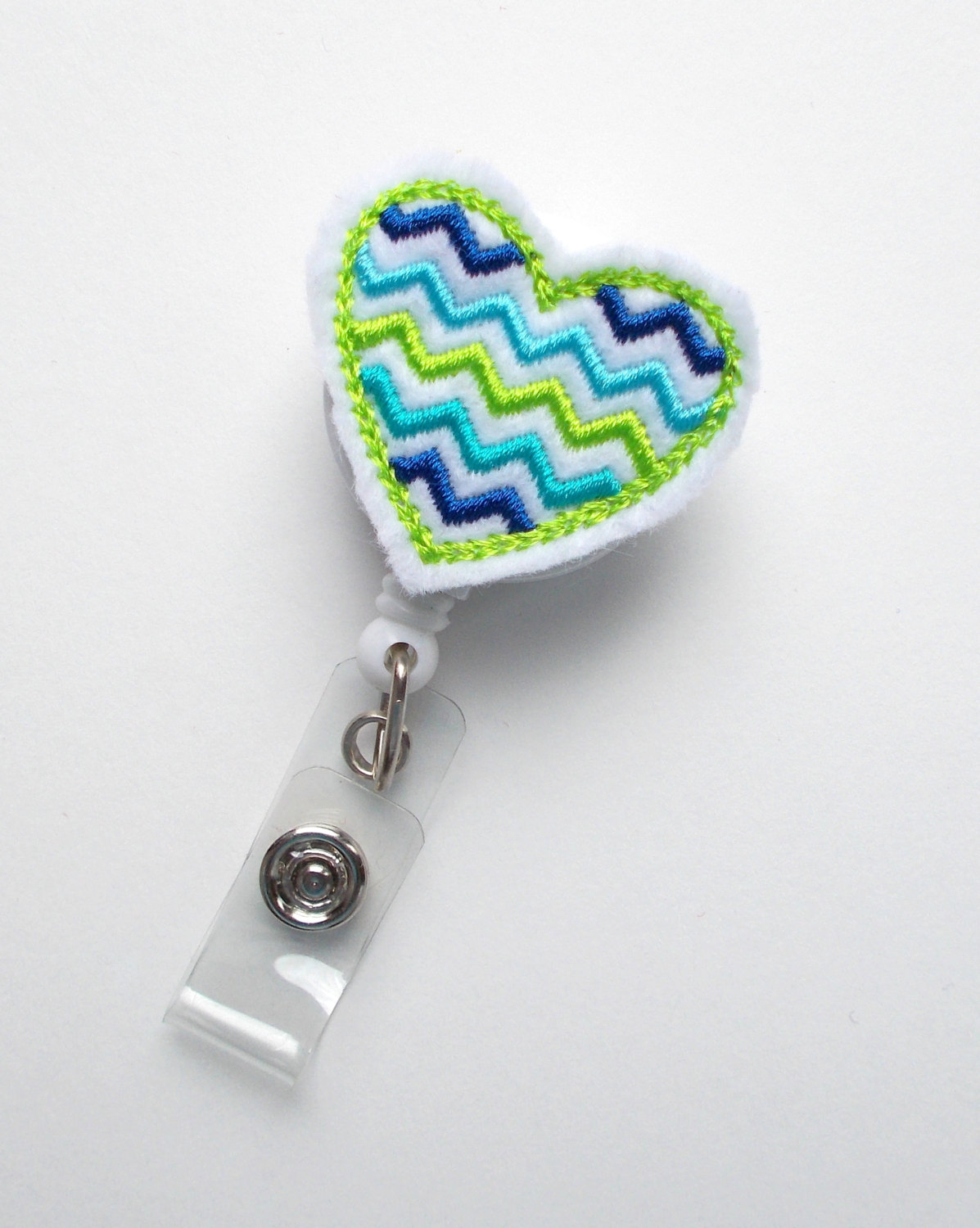 This retractable ID felt badge holder features a green and blue chevron heart felt applique. Applique sits on a white hard plastic badge reel.