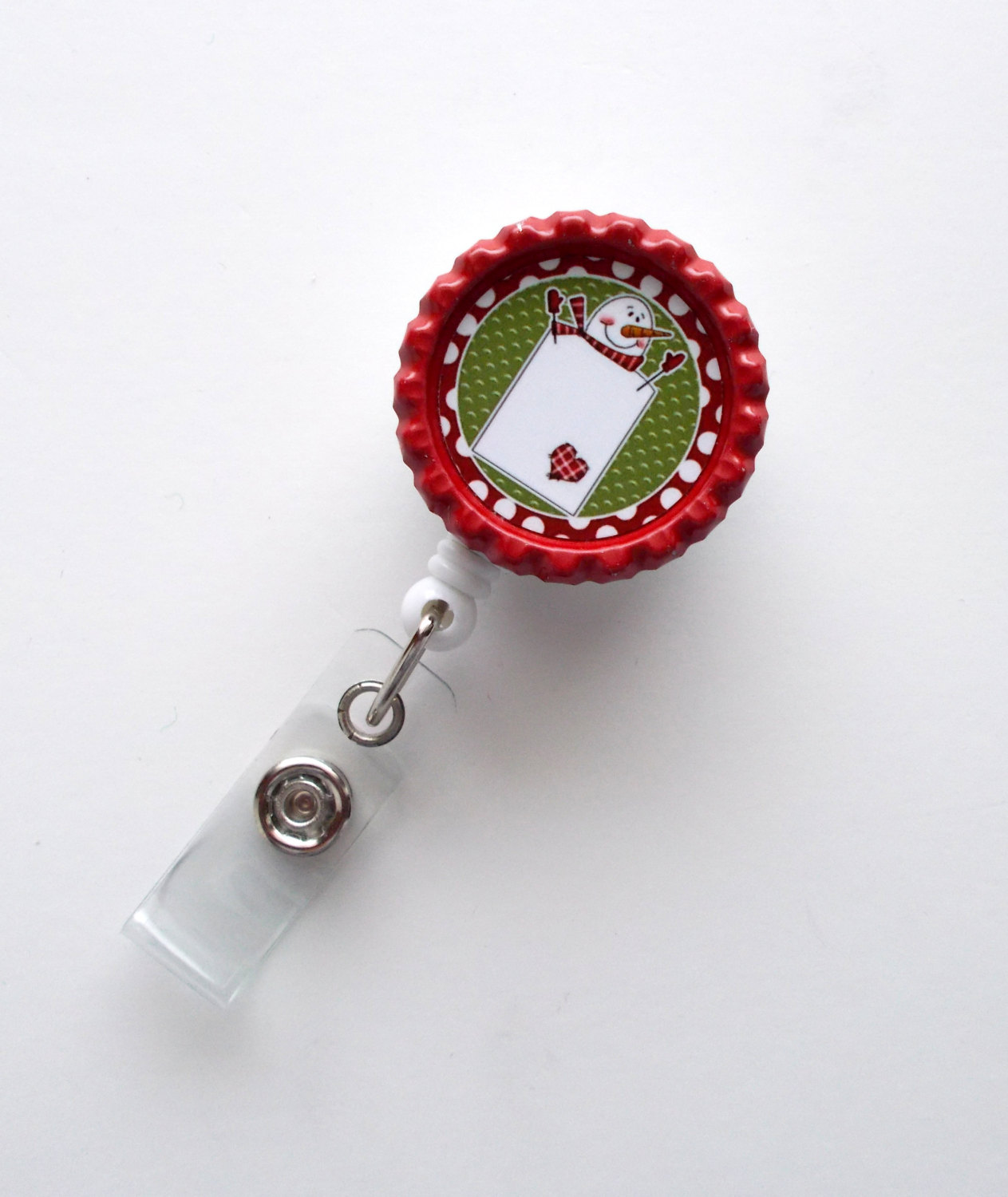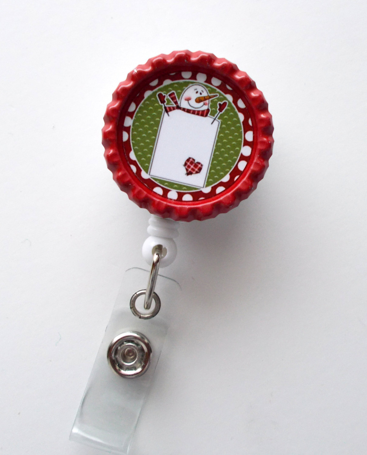 This ID Badge holder features a folk art Snowman. Graphic sets on a red bottle cap. Badge reel is white.
