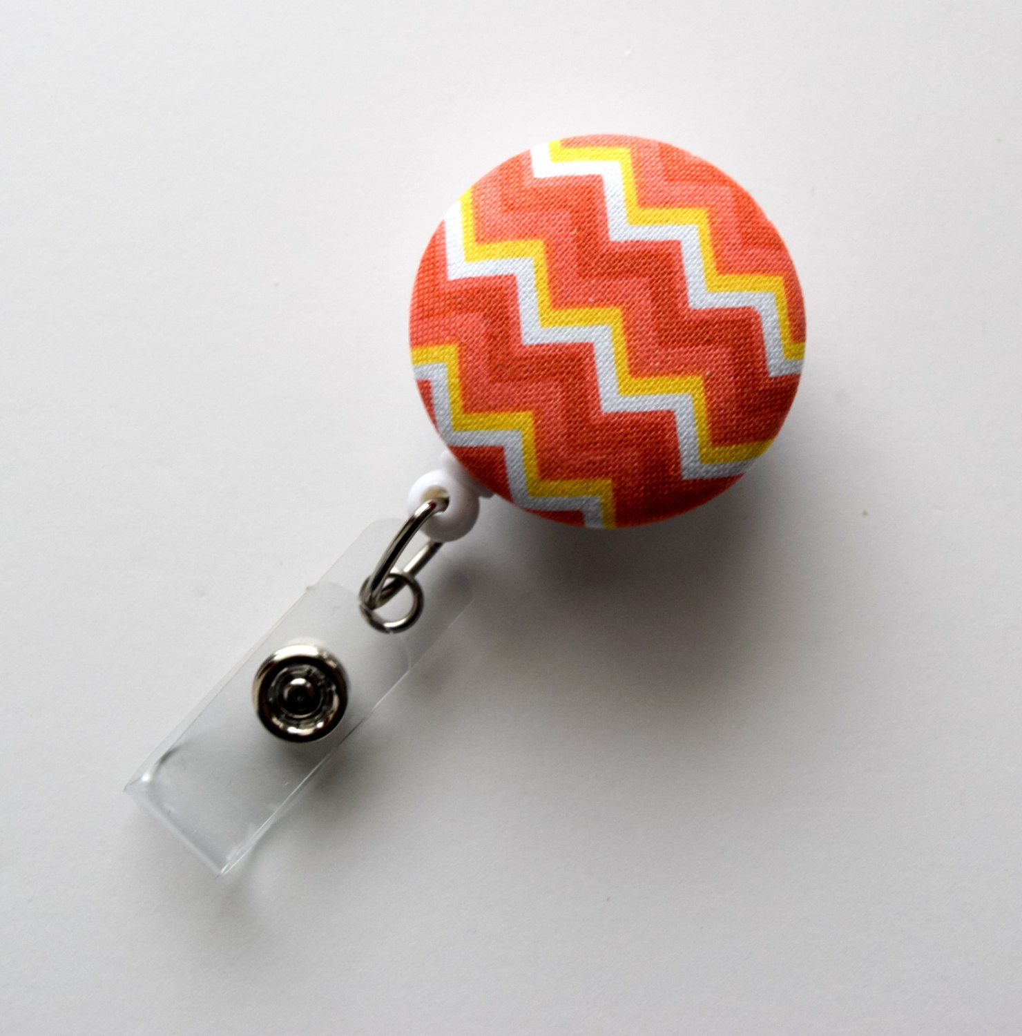 This ID badge holder features orange and yellow Chevron striped fabric covered button on a white badge reel. Super cute!