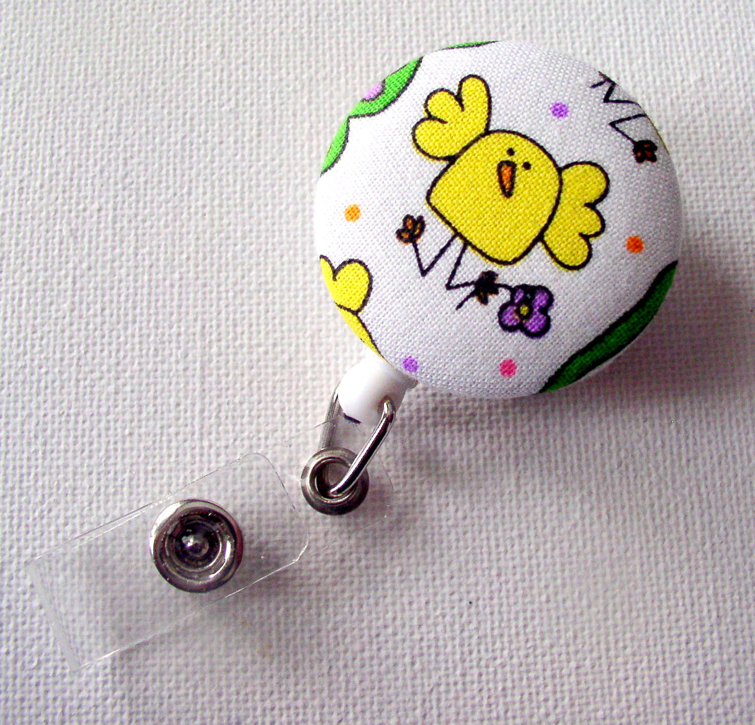 This fabric features a sweet little Easter Chick on a fabric covered button. Attached to a white retractable ID badge reel.