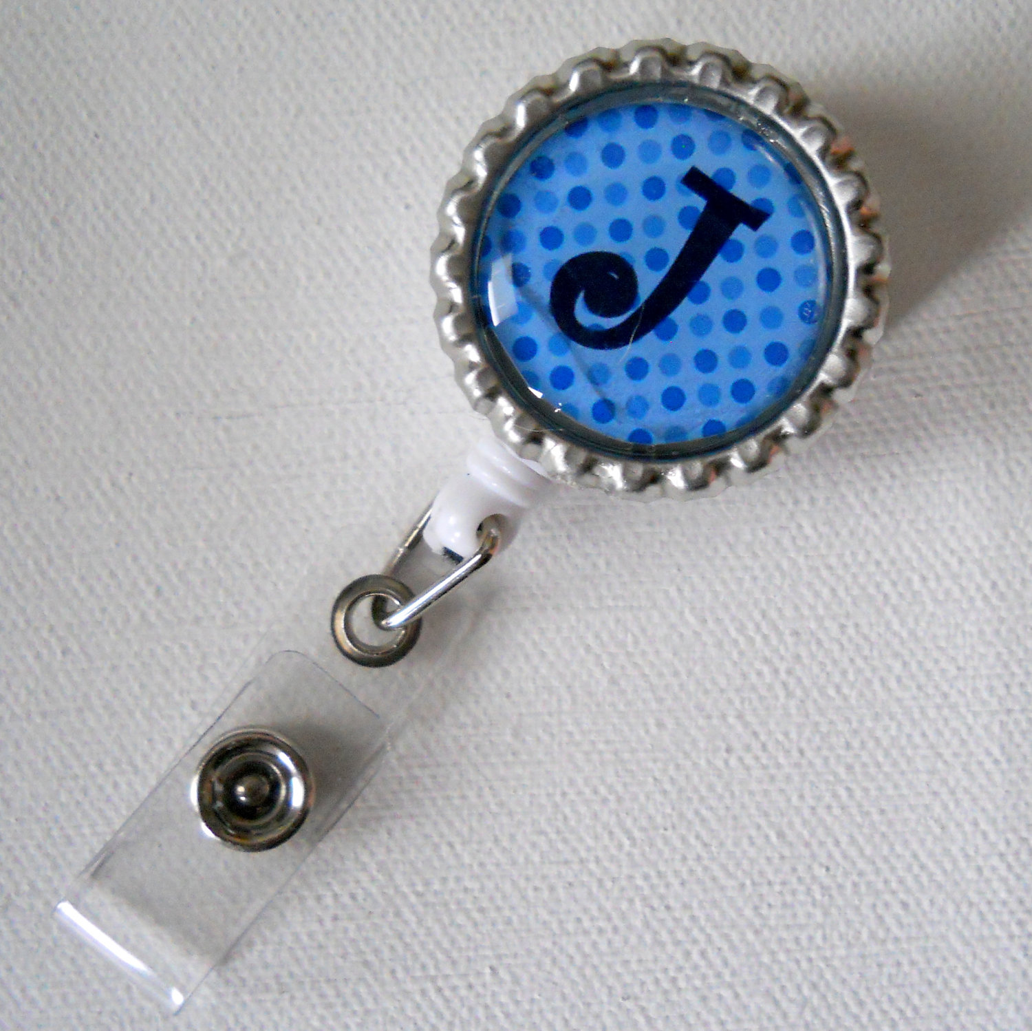 This badge can be personalized with your name or initials. It features a blue polka dot pattern with a black initial of your choice. If you prefer other initials or your personalized name just leave a note in the message box during checkout. Graphic is sealed with an epoxy sealant and sits on a silver bottle cap. Bottle cap is glued to a white, hard plastic badge reel.