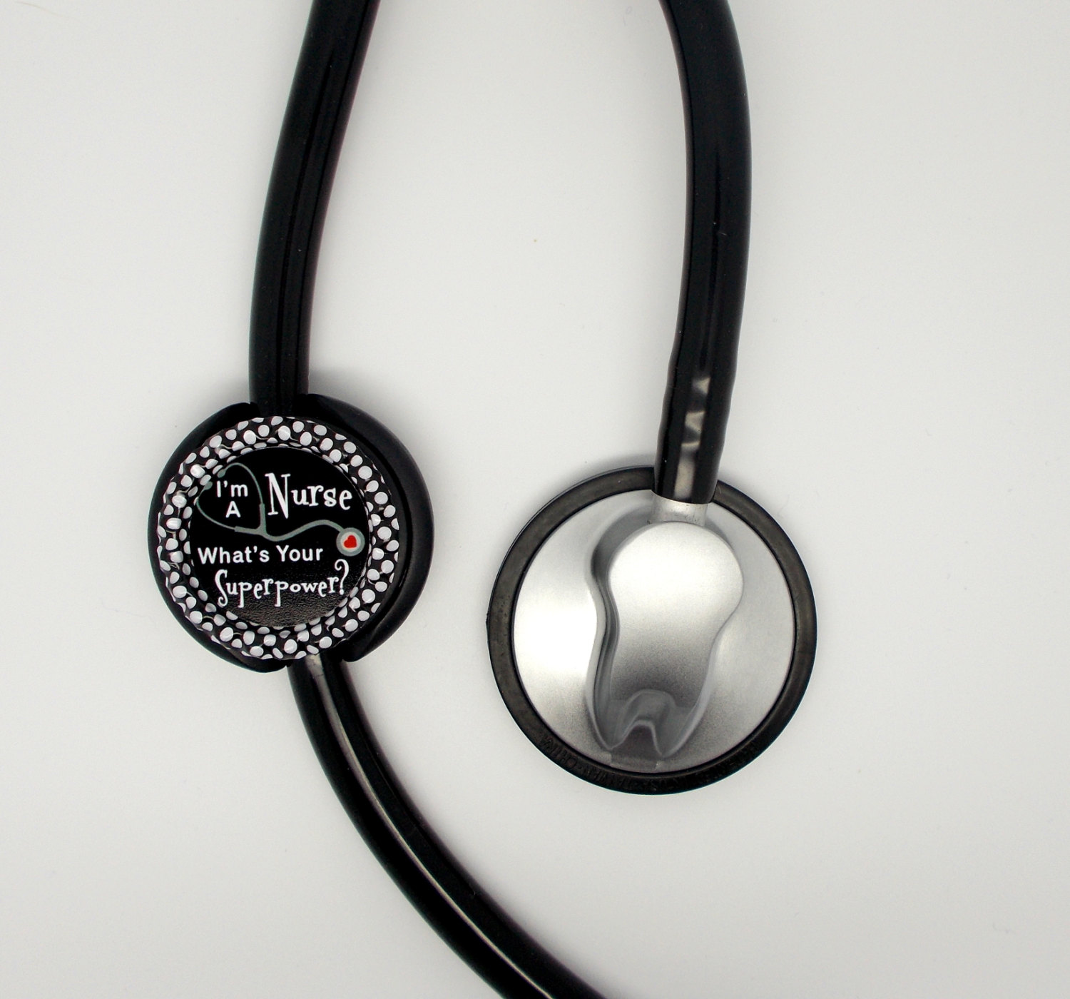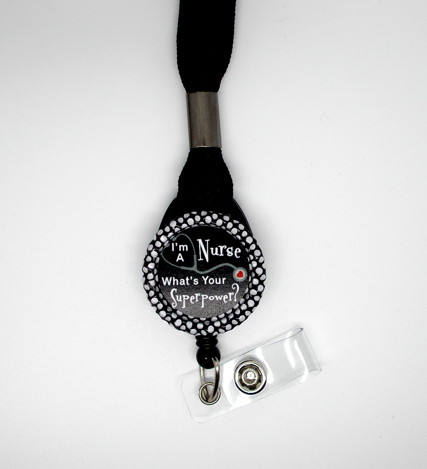 Your choice of a black lanyard or a stethoscope ID tag. This item features I'm A Nurse What's Your Superpower in black. Graphic is sealed with an epoxy sealant and is glued to a black and white gingham checked bottle cap. Bottle cap will be glued to your choice of a black lanyard or a stethoscope ID tag.