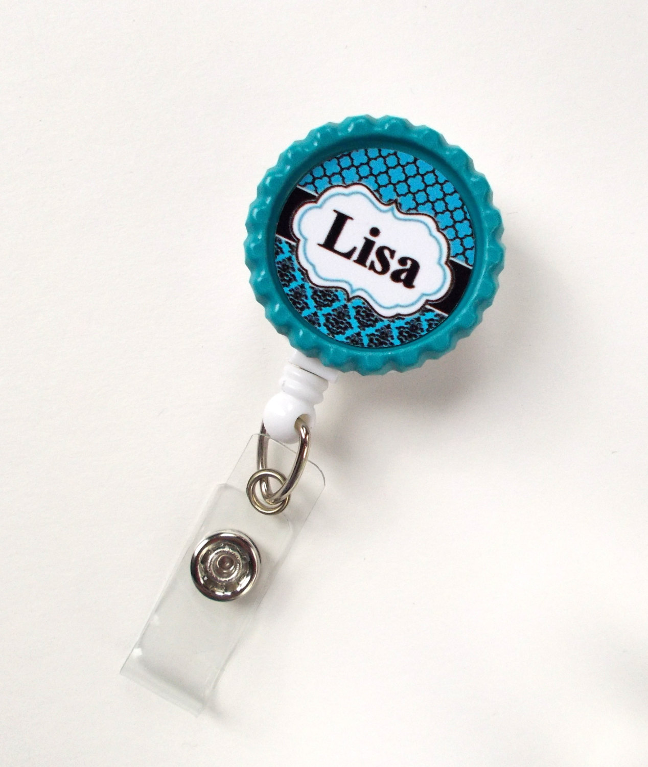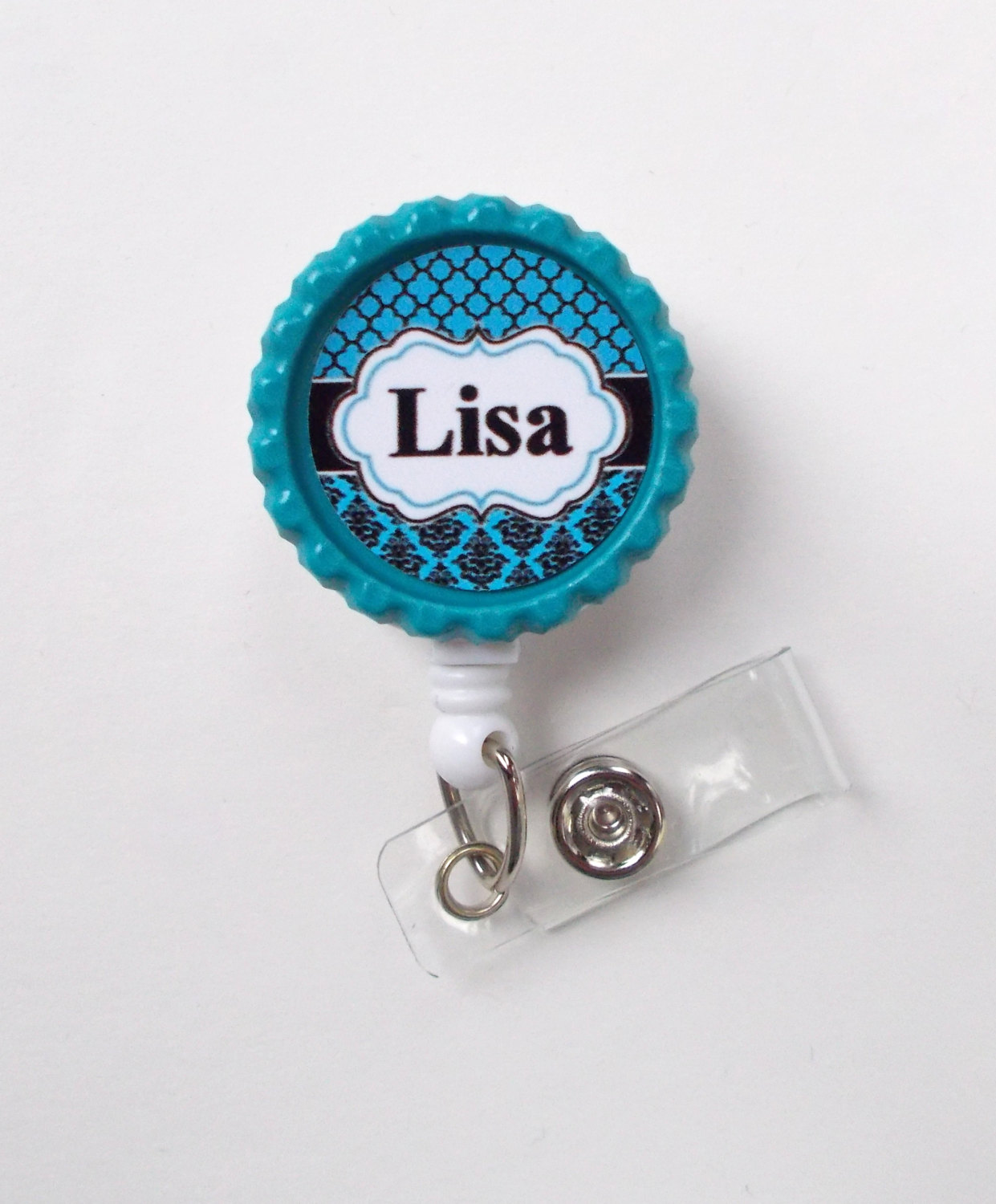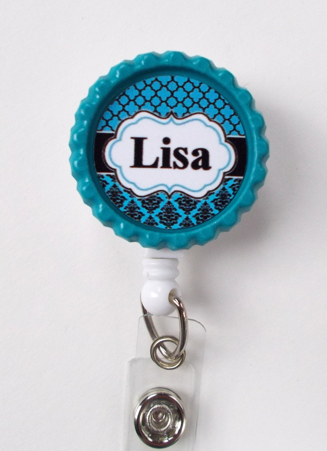 This badge can be personalized with your name or initials. It features a blue and black damask pattern with a black banner on each side of the name or initials. Graphic is sealed with an epoxy sealant and sits on a blue bottle cap. Bottle cap is glued to a white, hard plastic badge reel.