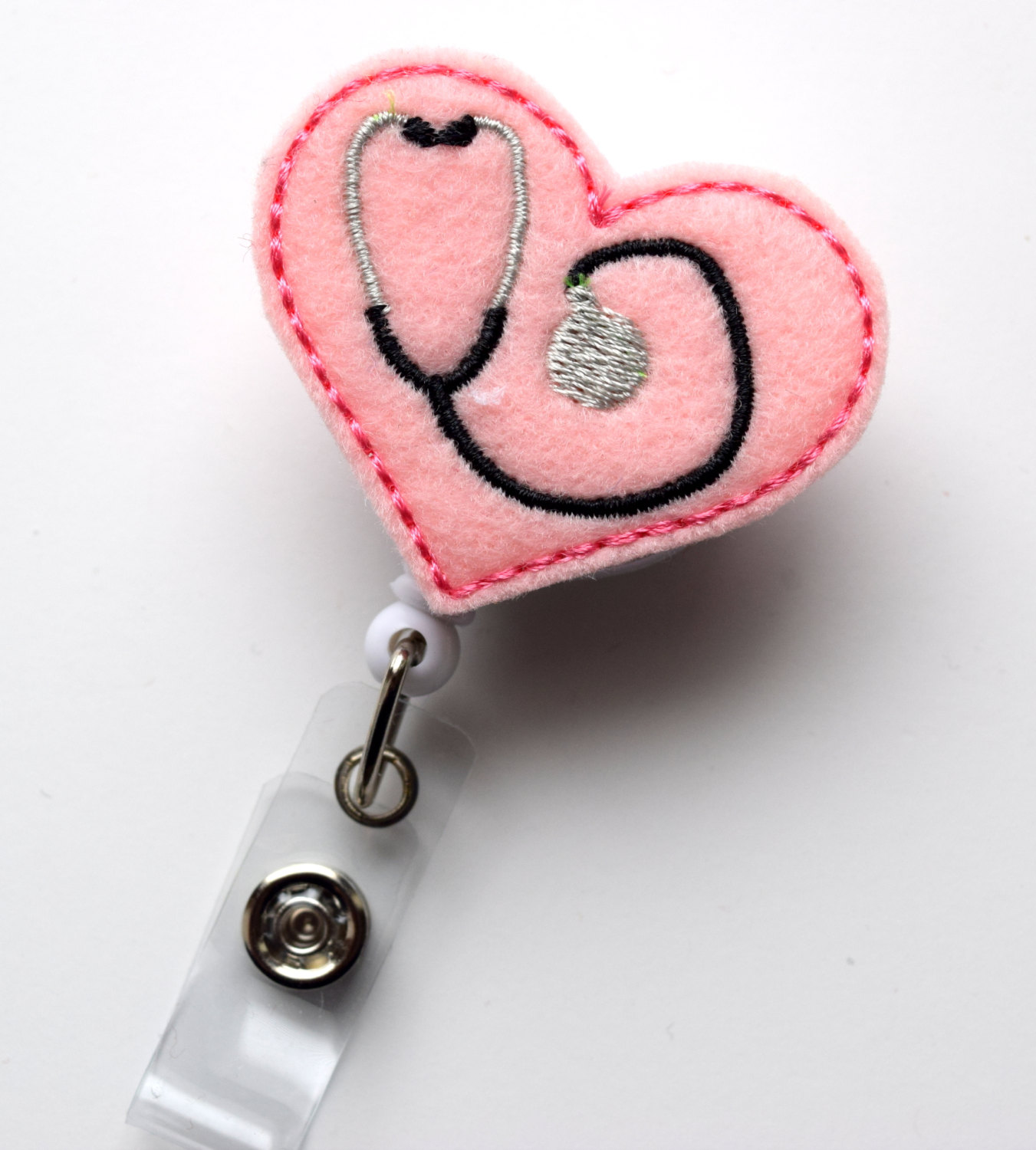 This retractable ID felt badge holder features a baby pink stethoscope felt applique. Feltie sits on a sturdy hard plastic, white badge reel.