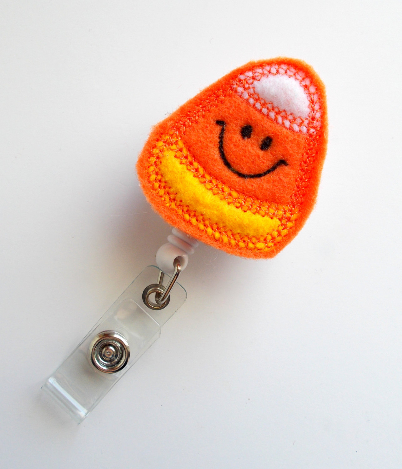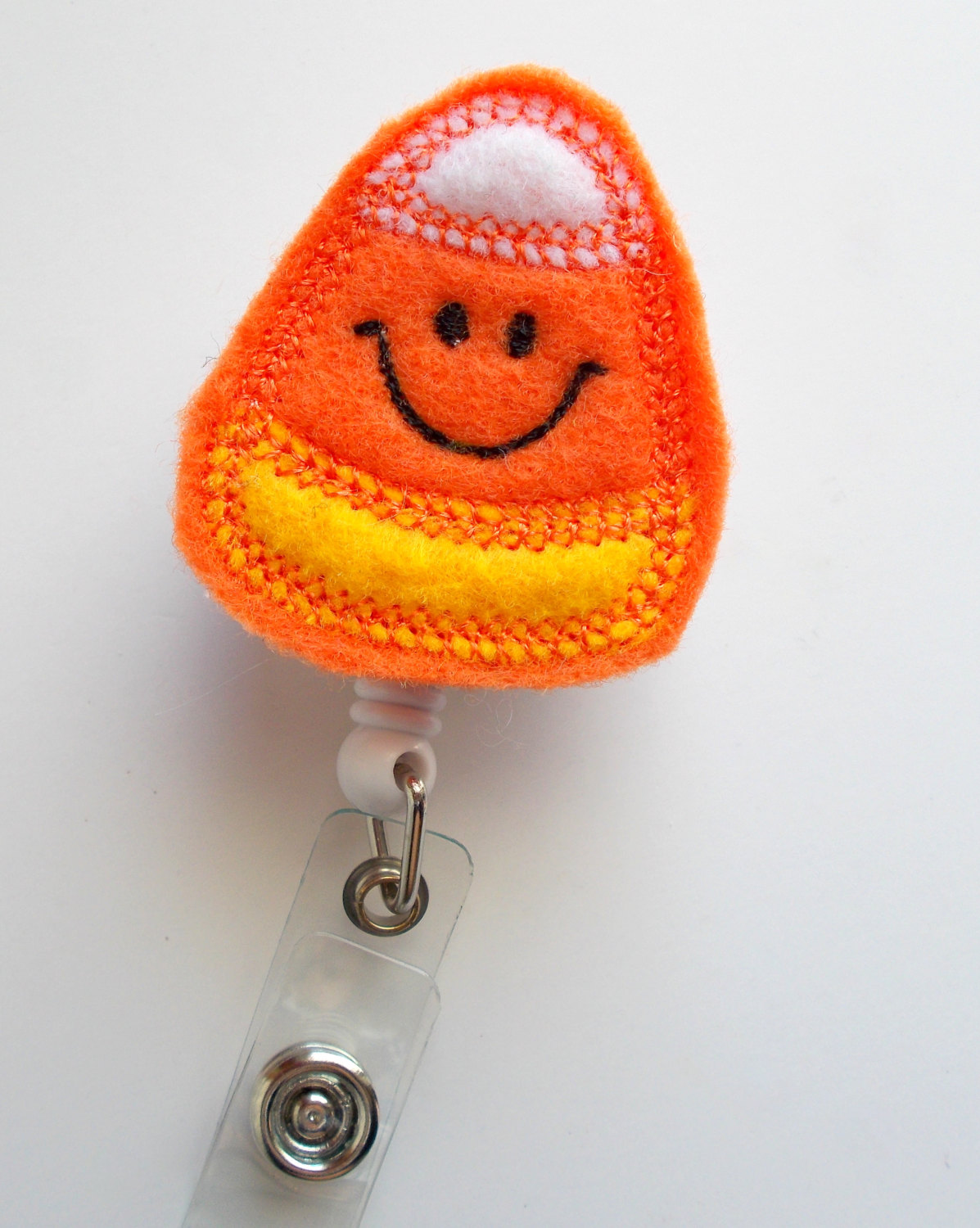 This badge holder features an orange, yellow and white candy corn felt applique. Super cute and perfect for the Halloween season.