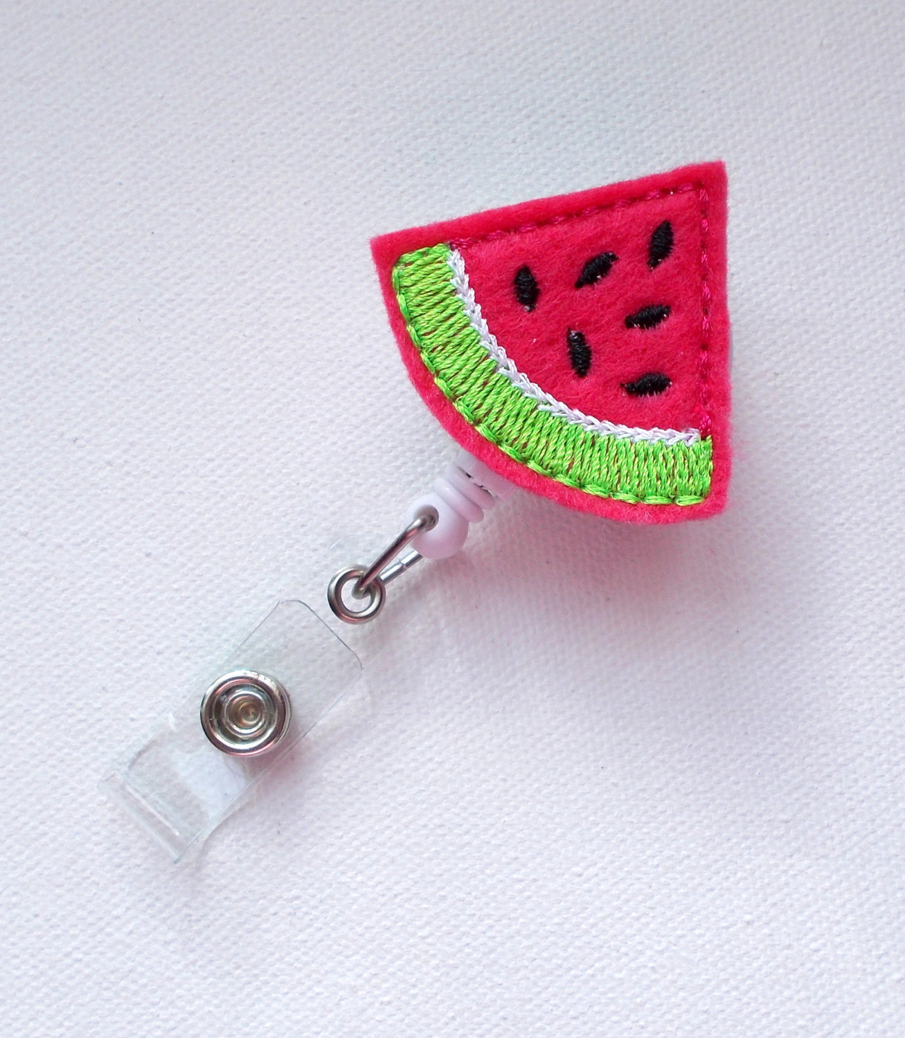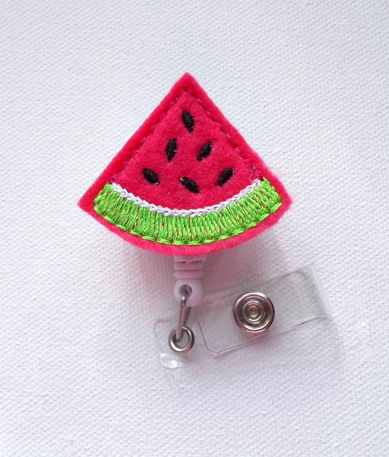 This retractable ID felt badge holder features a hot pink watermelon felt applique. Super cute and perfect for the upcoming spring and summer seasons. Sits on a white, hard plastic badge reel.