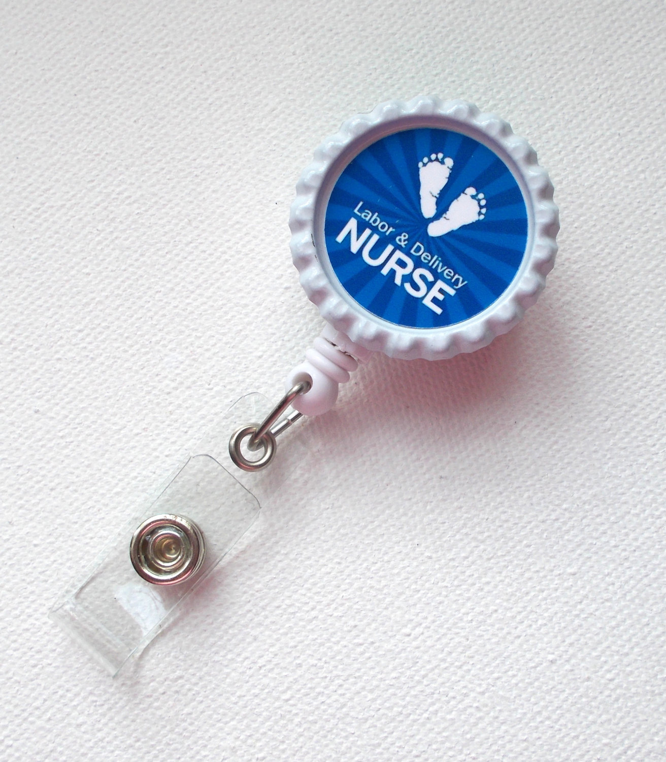 This badge features little feet with the phrase Labor & Delivery Nurse below the graphic. Graphic sets on a white bottle cap. Graphic is sealed with an epoxy sealant. You may wipe the graphic with a damp cloth to clean it but it is not waterproof.