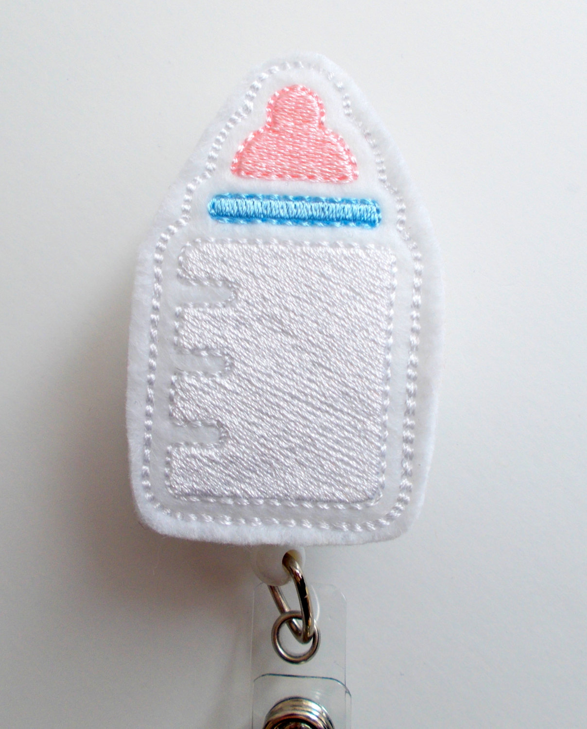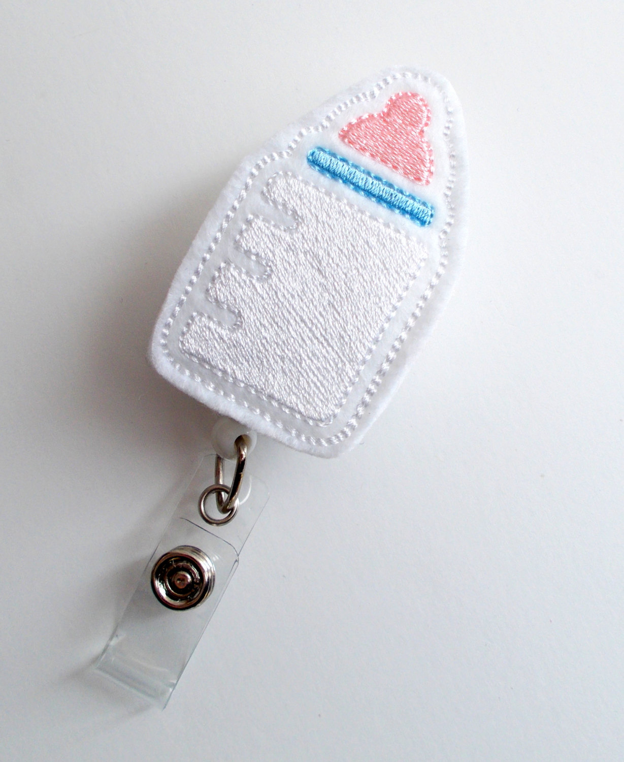 This retractable ID felt badge holder features a white, pink and blue baby bottle felt applique. Sits on a white, hard plastic badge reel.