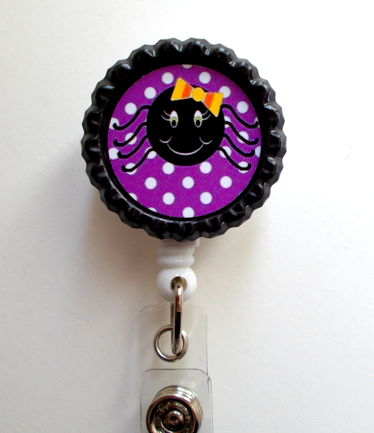 This ID Badge holder features a purple and white polka dot pattern accented with black spider. Sits on a black bottle cap. Bottle cap is glued to a white, hard plastic badge reel.