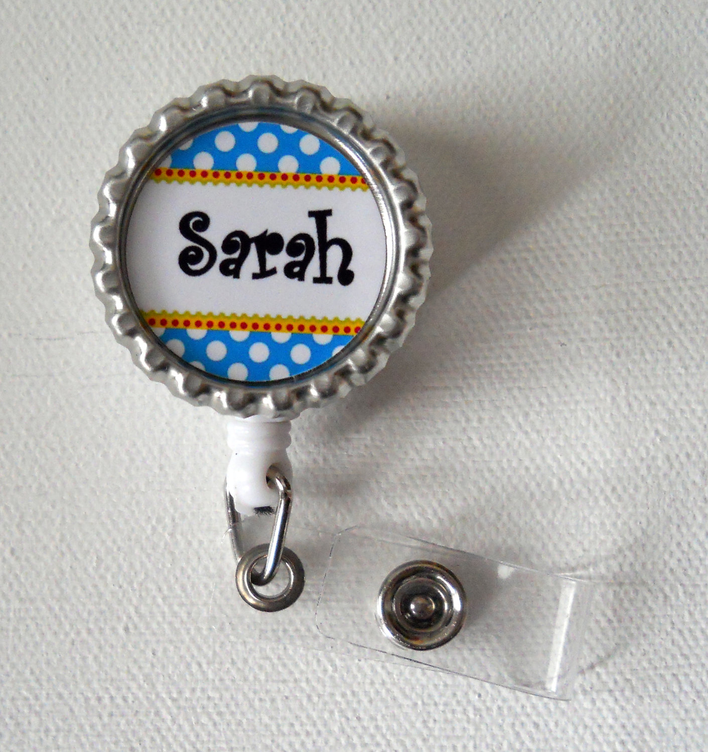 This is a personalized ID badge reel featuring a blue and white polka dot graphic on a silver bottlecap/bottle cap. Please indicate the name in a private message. If you'd like to add initials (e.g. RN, LPN, etc.) just let me know. I can add that at no additional charge. I can customize to your exact specifications.
