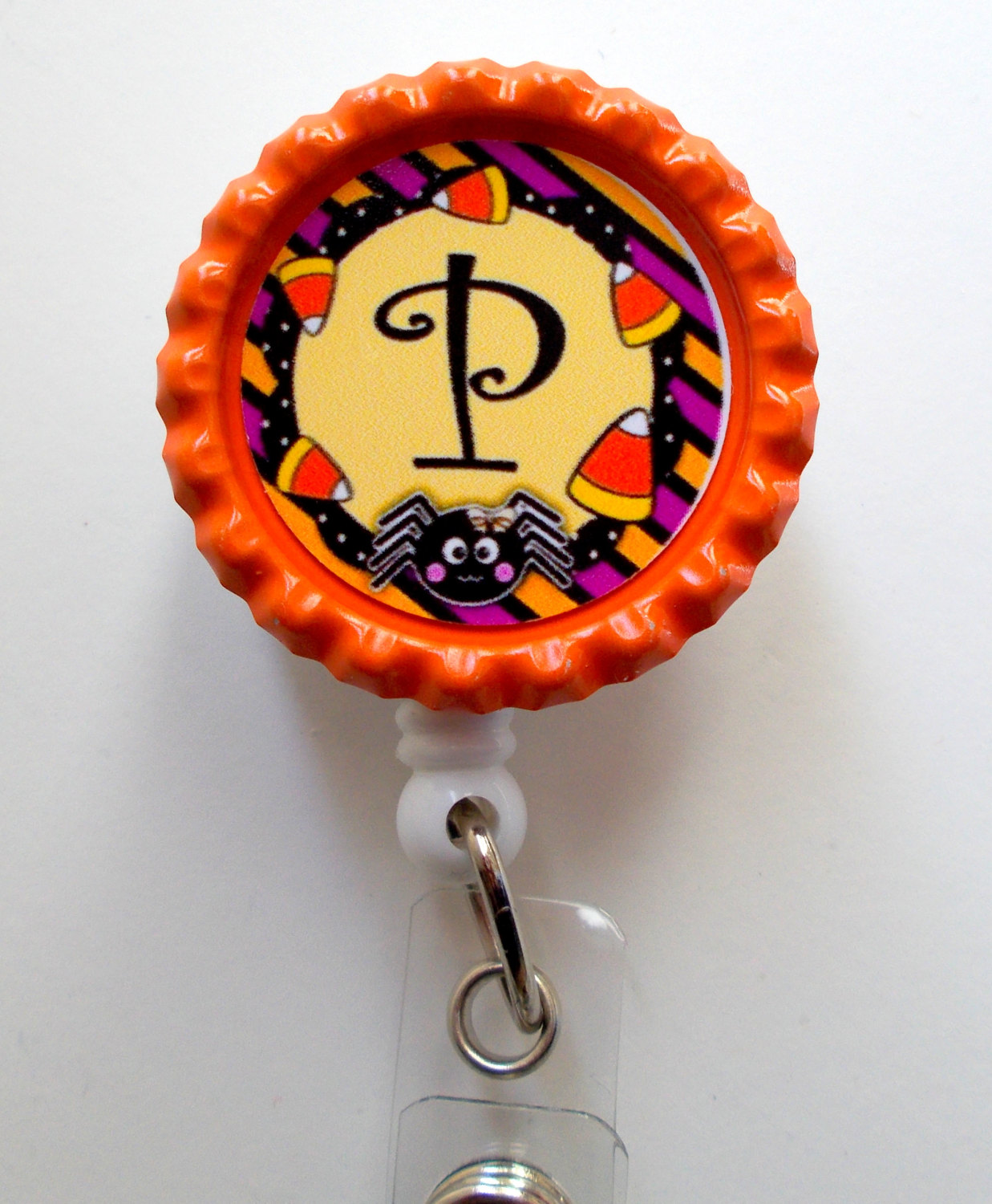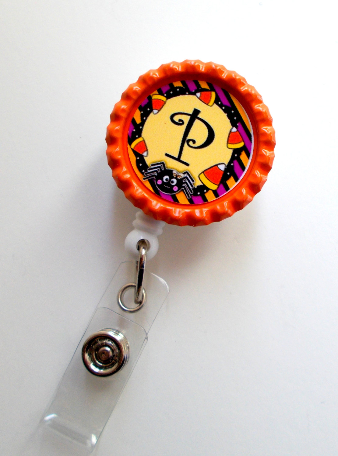 This bottle cap badge holder will be customized with the initial of your choice. If your initials aren't listed, after purchasing this listing just indicate in the note section what initials you would like your badge reel to feature. Orange bottle cap sits on a white, hard plastic badge reel.