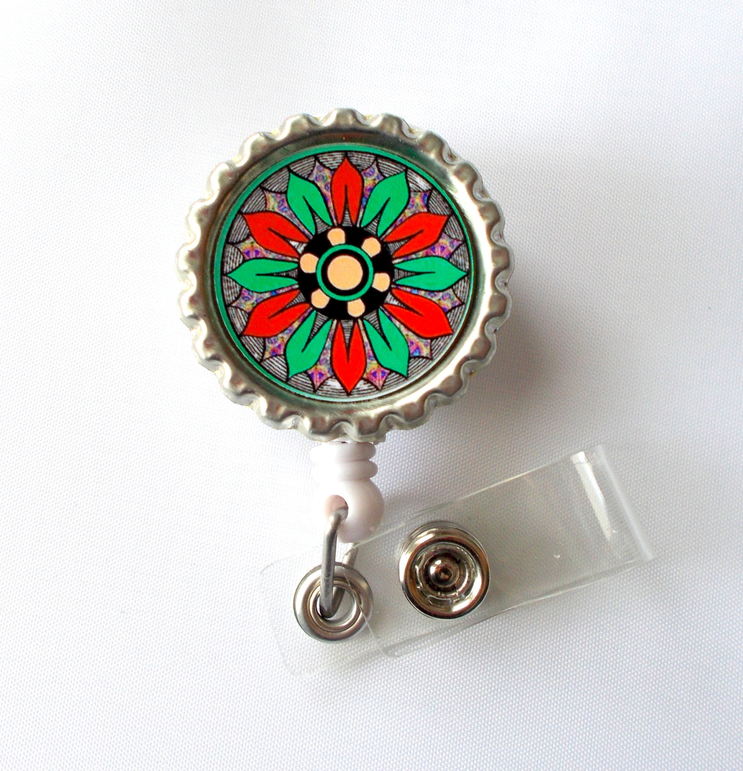 Funky Flower Green and Red - Flower Badge Holder - Nursing Badge Holder - ID Badge Reel - Nurse ID Badge Clip