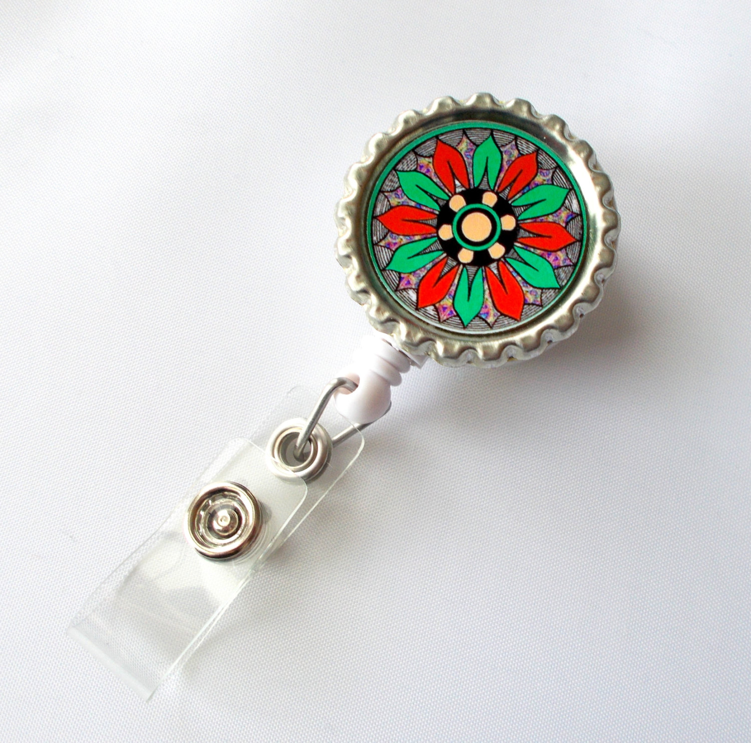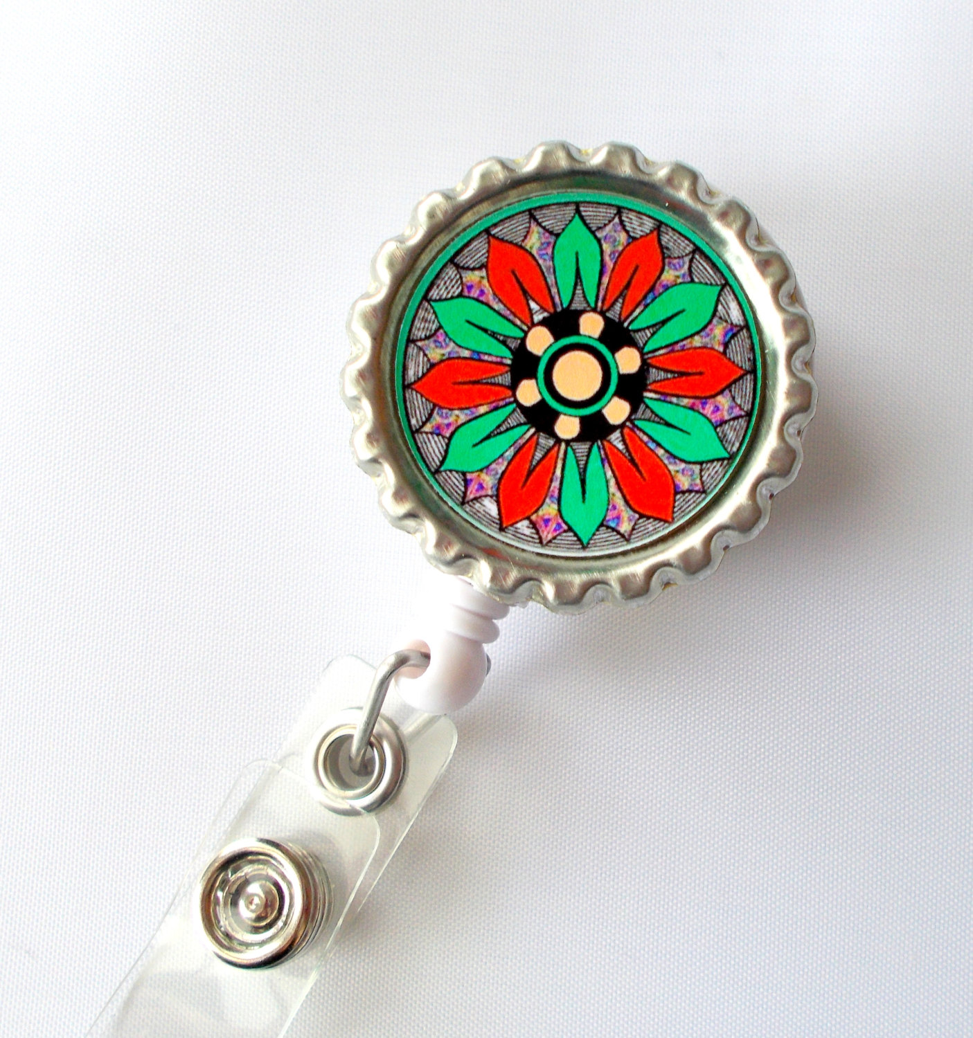 This bottle cap badge reel features a funky flower in green and red with a yellow center. Graphic sits on a silver bottle cap. Super cute and sure to brighten your day!
